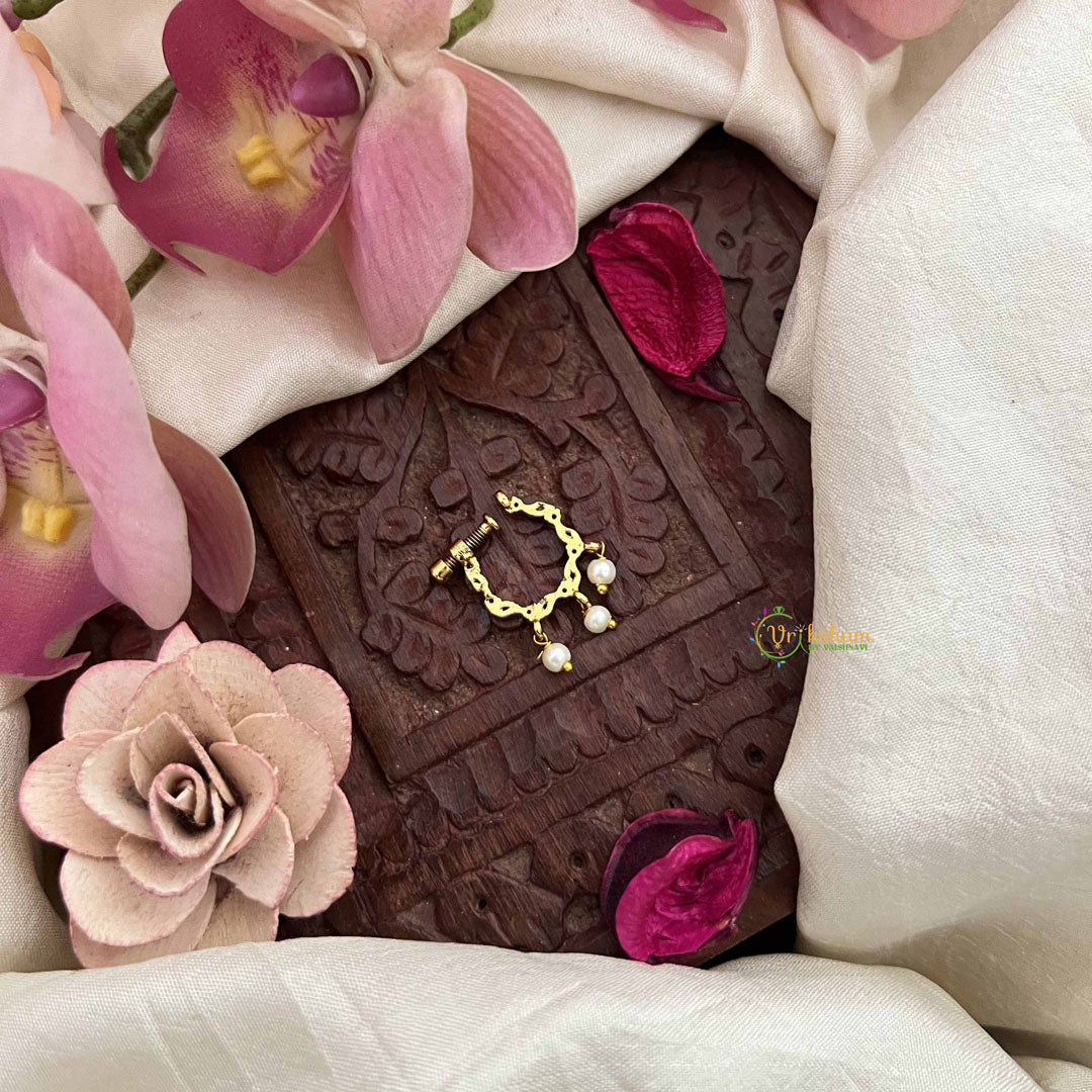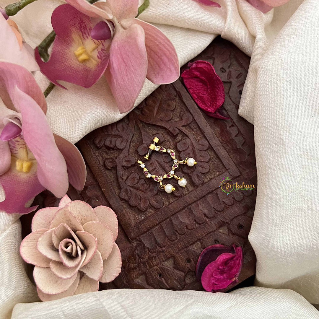 The Vriksham Unique 3 Pearls Drop Motif Press Naths in red and white showcases an elegant drop design with three beautifully arranged pearls. Its secure press-fit offers comfort while adding a sophisticated blend of classic color and modern style. This nose pin is a refined accessory that enhances both traditional and contemporary looks with subtle grace.