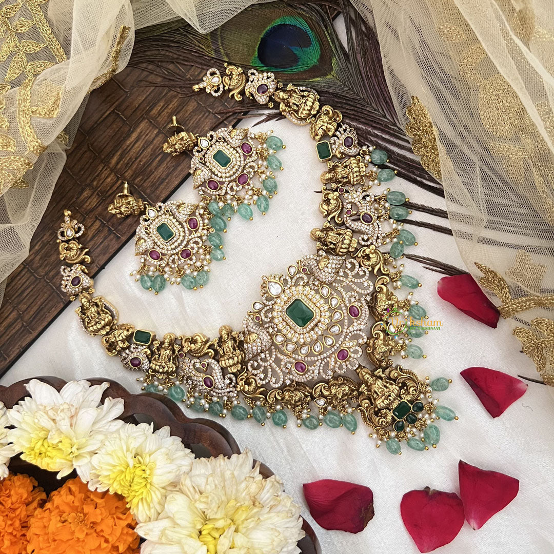 The Vriksham Unique AD Stone Lakshmi Neckpiece features elegant green beads paired with distinctive AD stone detailing. This sophisticated piece showcases a refined Lakshmi design, blending traditional artistry with contemporary elegance. Perfect for special occasions, it adds a graceful and timeless charm to your ensemble.