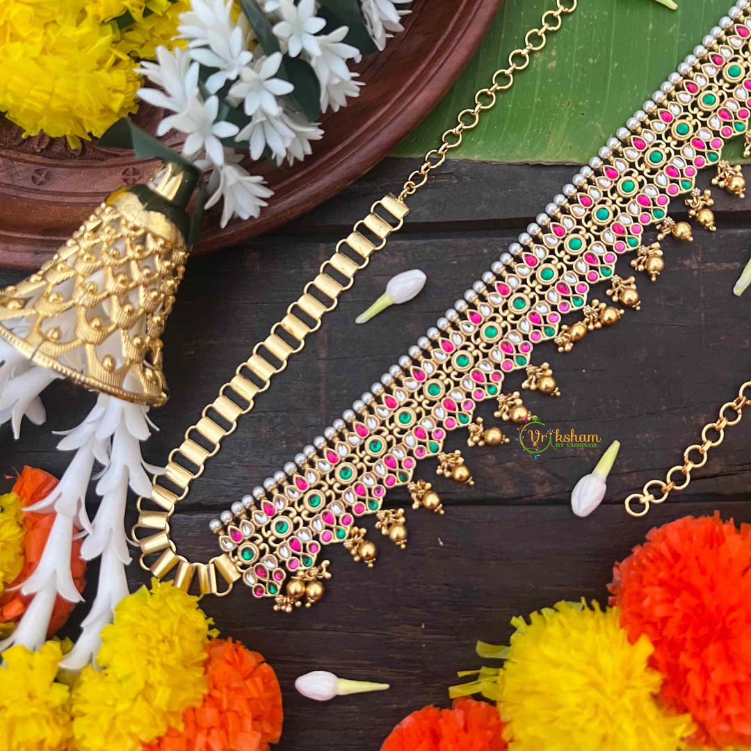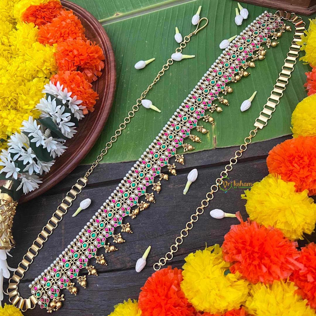 Captivate with this distinctive bridal floral Kundan Jadau Guttapusalu hipchain, where botanical elegance meets masterful traditional craftsmanship. This exquisite piece showcases intricate floral motifs rendered in authentic Kundan technique, enhanced by the textural richness of Guttapusalu work and adorned with gleaming gold beads. The harmonious composition creates a hipchain that drapes with effortless grace, adding a layer of refined sophistication to bridal attire. Designed for weddings, festive celebrations, and milestone occasions, this accessory exemplifies the pinnacle of Indian jewelry artistry. Every detail has been thoughtfully executed to deliver a wearable masterpiece that honors heritage while making a distinctive statement, offering timeless beauty that transcends generations and becomes a treasured family heirloom.