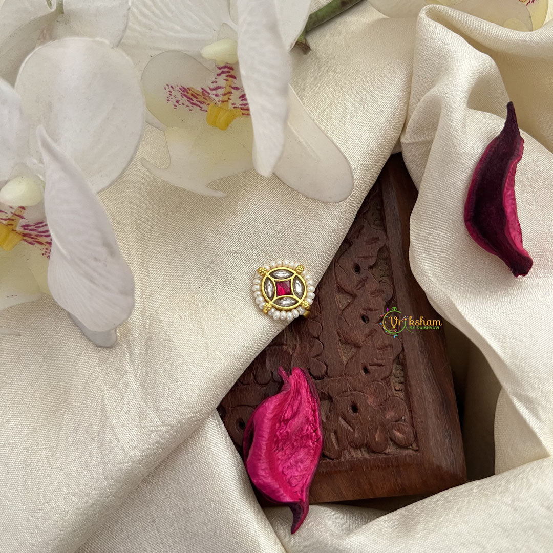 Experience the elegance of Vriksham's Unique Circle Red Jadau Kundan Nath, adorned with exquisite pearls. Handcrafted with precision, this Nath embodies luxury and sophistication. Elevate your look and make a statement with this one-of-a-kind accessory. Perfect for special occasions and adding a touch of opulence to any outfit.