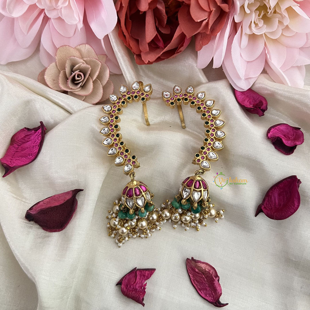 Embrace the refined elegance of Vriksham's Unique Cuff Jhumkas. These distinguished ornaments showcase an innovative design that merges traditional aesthetics with contemporary sensibility. The harmonious composition features subtle aqua green and off-white beads that create a captivating interplay of color and texture. The distinctive cuff jhumka silhouette offers both the classic cascade effect and secure comfort, ensuring effortless sophistication.