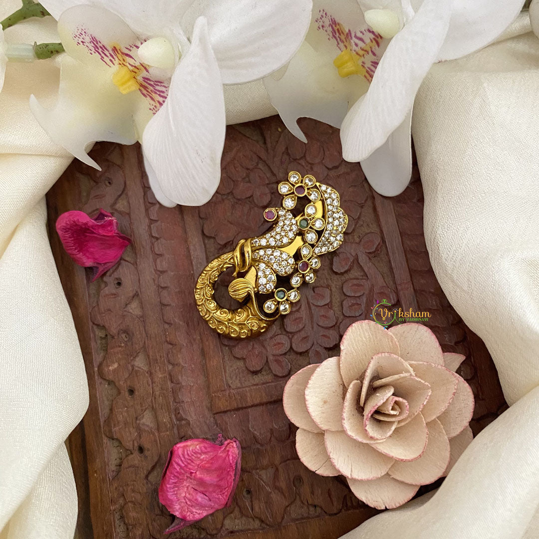 Add a touch of elegance and sophistication to your saree with the Vriksham Unique Designer AD Stone Saree Pin. Featuring intricate design and exquisite red, green, and white stones, this brooch is the perfect accessory to elevate your outfit. Stand out and make a statement with this exquisite saree pin.