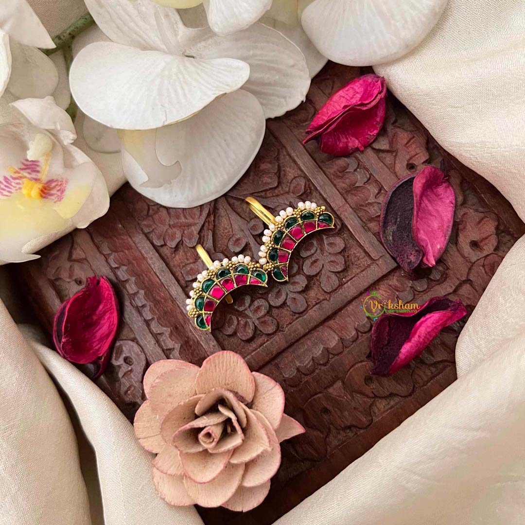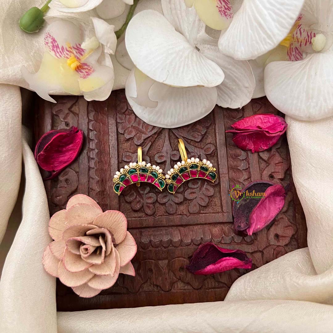 Unveil the captivating allure of this Unique Down Side Emerald Ruby Crescent Pearl Detailing Kundan Jadau Bugadi, where inverted elegance meets precious gemstone artistry. The downward-facing crescent design, adorned with rich emeralds and deep rubies, creates a distinctive silhouette that commands attention while maintaining refined grace. Meticulously crafted using traditional kundan and jadau techniques, each gemstone is individually set to maximize brilliance and ensure heirloom durability. Pearl detailing adds luminous accents that enhance the overall composition with subtle sophistication. This exceptional piece celebrates innovative design paired with masterful craftsmanship, making it an extraordinary choice for discerning brides and collectors who seek jewelry that transcends convention while honoring timeless Indian artistry.