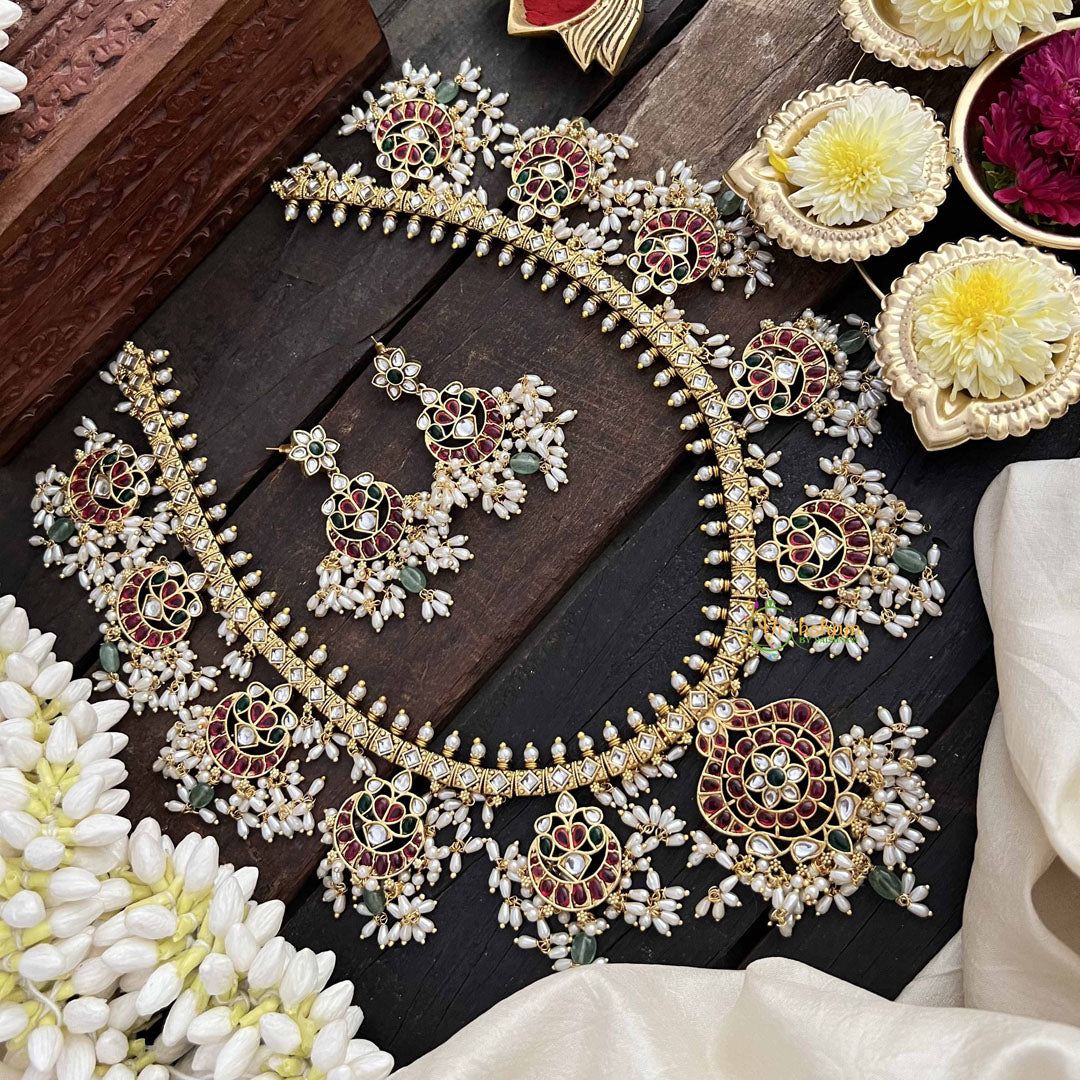 The Vriksham Unique Dual Peacock Guttapusalu Long Neckpiece showcases exquisite craftsmanship with two elegant peacock motifs surrounded by delicate rice pearls. This sophisticated design brings a graceful charm to any traditional outfit, making it a standout accessory for special occasions. Its timeless appeal ensures lasting beauty and refined style.