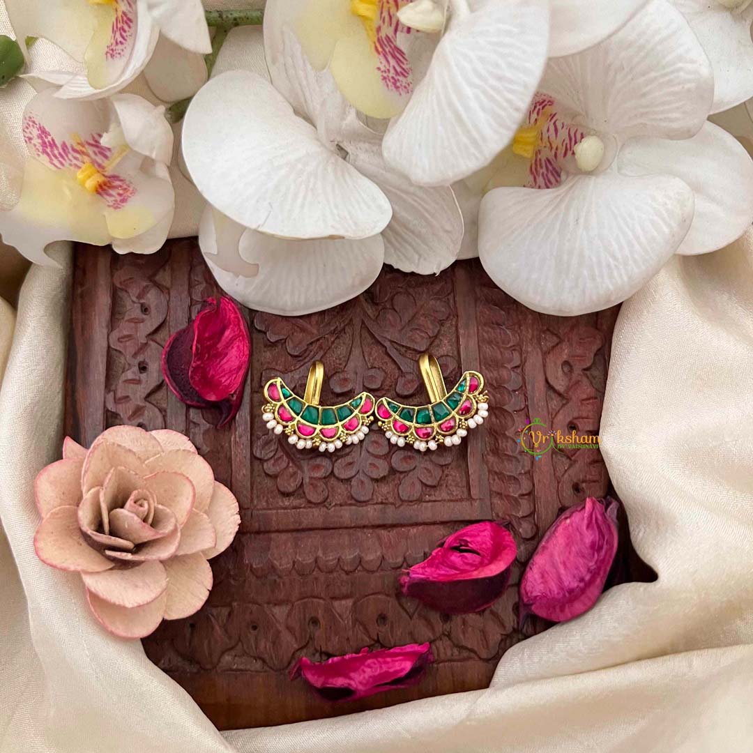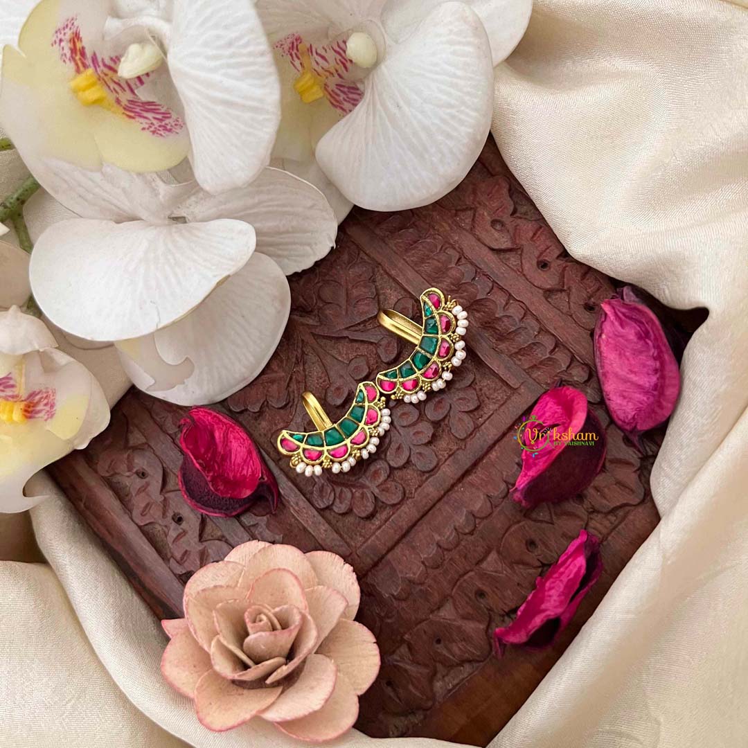Discover unparalleled elegance with this Unique Emerald Ruby Crescent Pearl Detailing Kundan Jadau Bugadi, a striking composition that marries celestial symbolism with precious gemstones. The crescent motif, adorned with vibrant emeralds and deep rubies, is meticulously crafted using traditional kundan and jadau techniques that ensure lasting brilliance and durability. Delicate pearl detailing adds luminous sophistication, creating a captivating interplay of color and light. This distinctive piece celebrates the artistry of master craftsmen who honor centuries-old traditions while creating contemporary treasures. Perfect for brides seeking something extraordinary and collectors who appreciate rare, handcrafted jewelry, this bugadi is a statement of refined taste and cultural reverence.