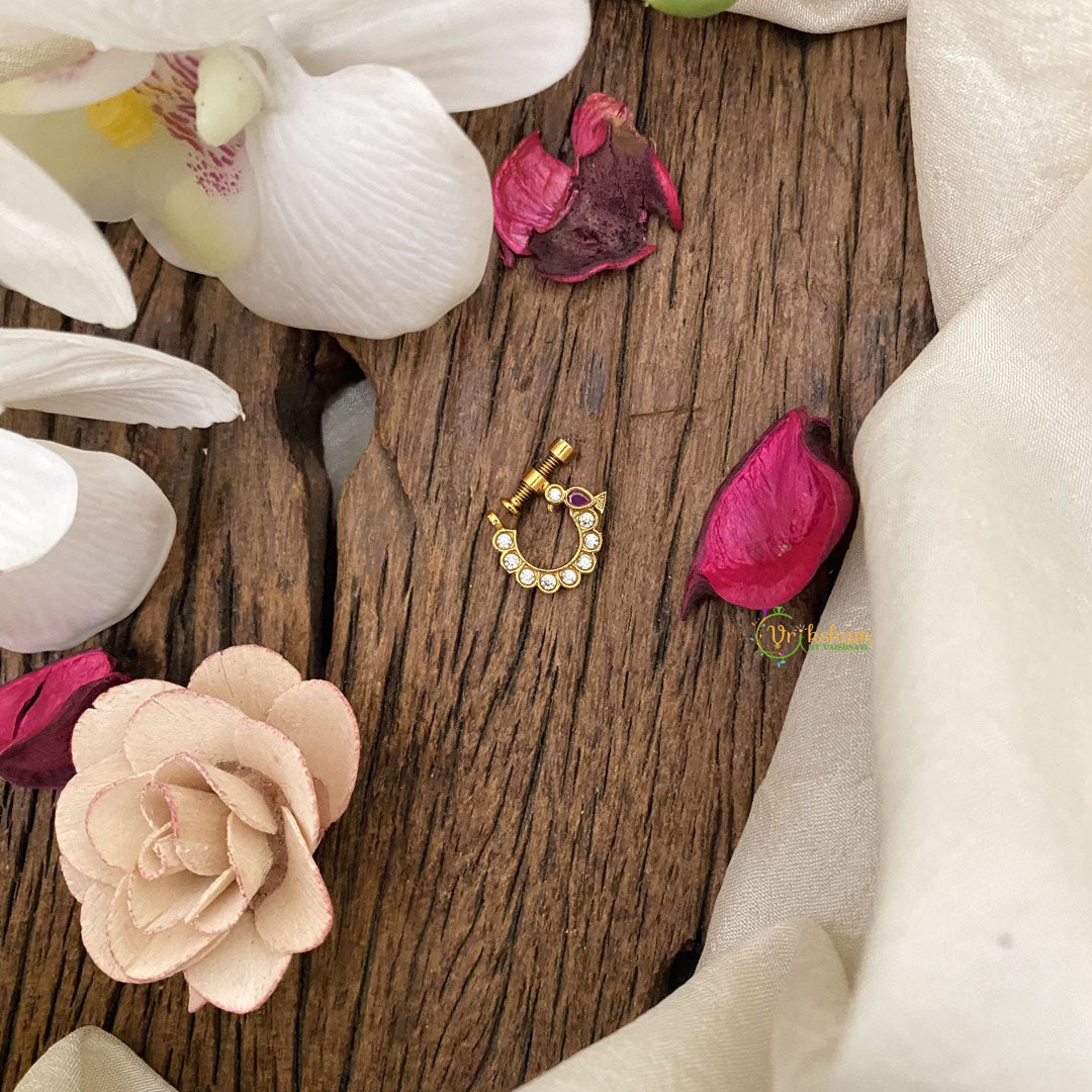 Take your look to the next level with our Vriksham Unique Floral Golden Naths/Nose pin in the stunning "Bird-White Red" design. Handcrafted with intricate floral details, this nose pin exudes elegance and exclusivity. Complete your outfit with this luxurious accessory that echoes the beauty and grace of nature.