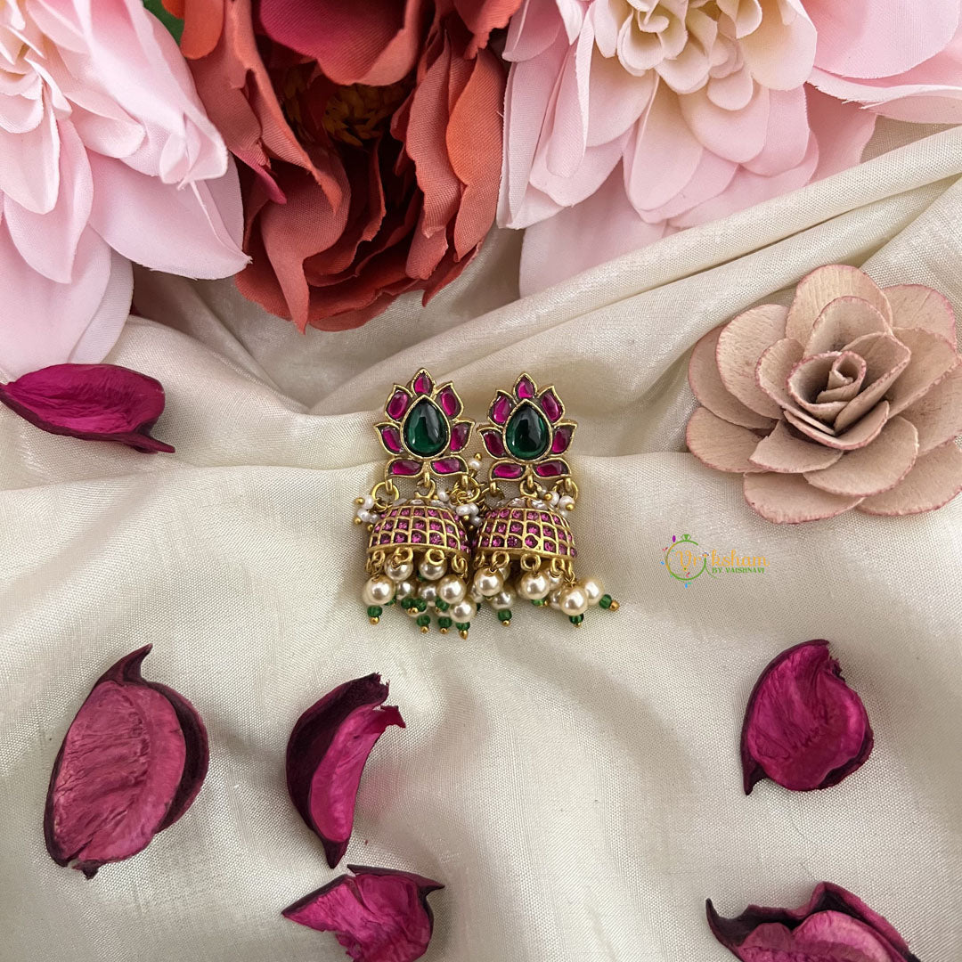 Indulge in the sublime elegance of Vriksham's Unique Floral Jadau Kundan Jhumkas. These distinguished ornaments showcase an exquisite floral motif meticulously crafted using traditional Jadau Kundan techniques. The refined composition features subtle off-white beads and luminous pearls that create a harmonious interplay of texture and gentle luminosity. The classic jhumka silhouette offers graceful movement with each gesture, capturing light with understated brilliance.