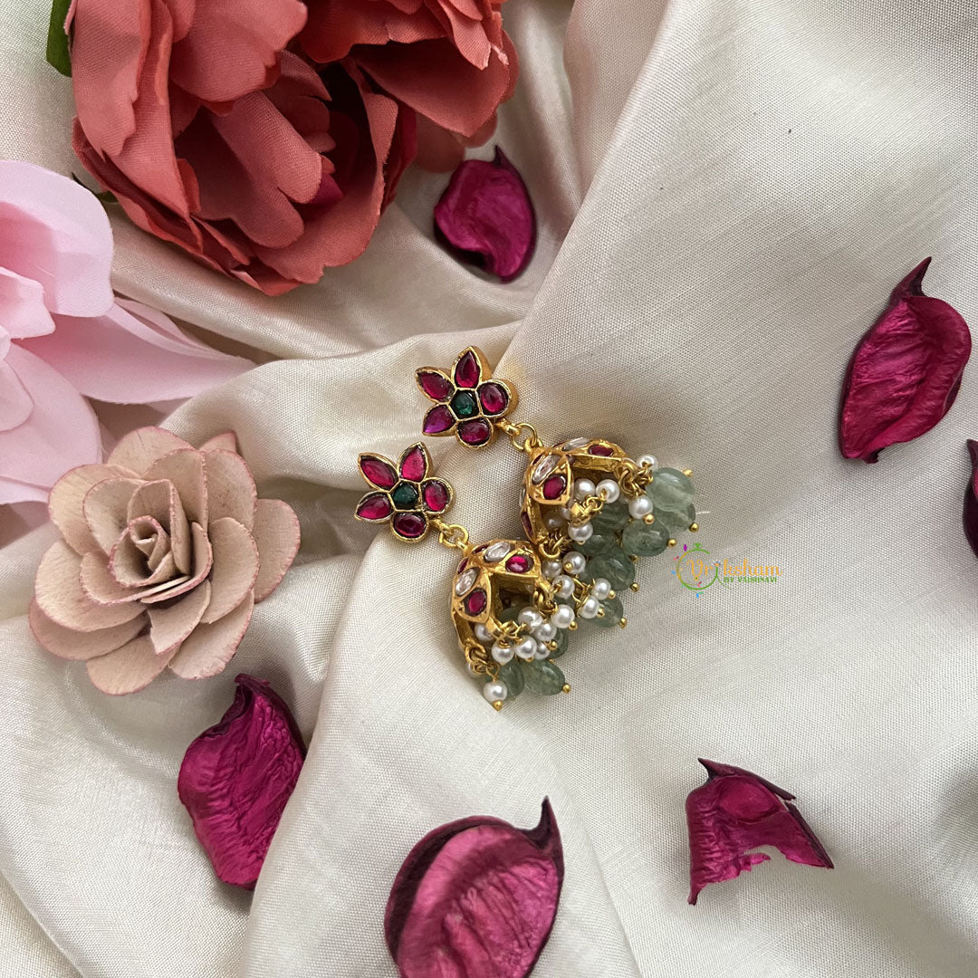 Embrace the refined opulence of Vriksham's Unique Floral Jadau Kundan Jhumkas. These distinguished ornaments feature an intricate floral design rendered through the revered artistry of traditional Jadau Kundan craftsmanship. The harmonious interplay of rich red, pristine white, and verdant green creates a captivating visual narrative, thoughtfully complemented by delicate pastel green beads and lustrous pearls that capture light with subtle brilliance. The classic jhumka silhouette provides graceful movement and dimensional presence.