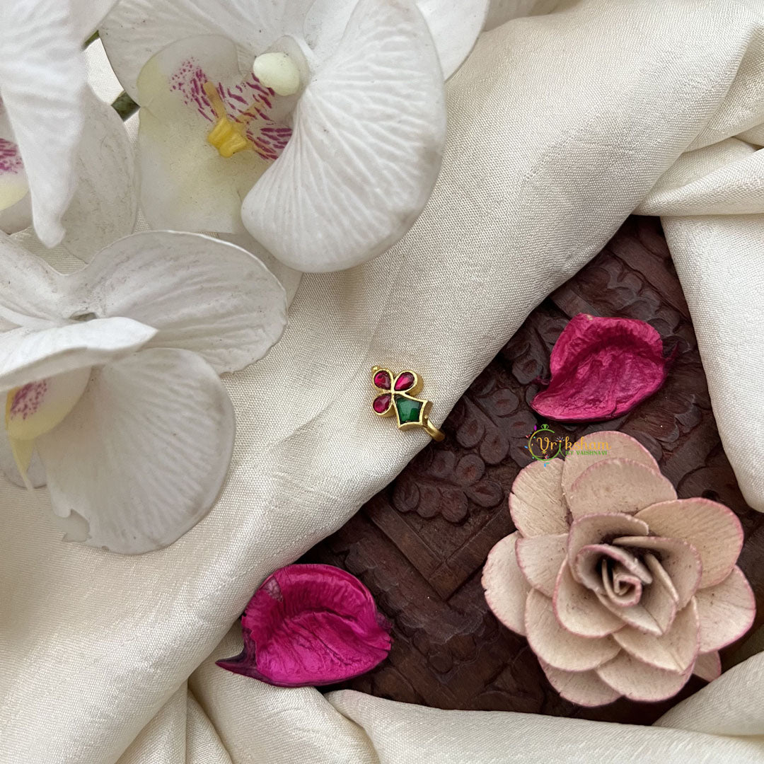 The Vriksham Unique Floral Jadau Kundan Nath in red and green showcases intricate floral designs crafted with exceptional precision. This sophisticated piece blends traditional Jadau and Kundan artistry with vibrant colors, offering a refined accessory that enhances your festive or formal ensemble with elegance and cultural richness.