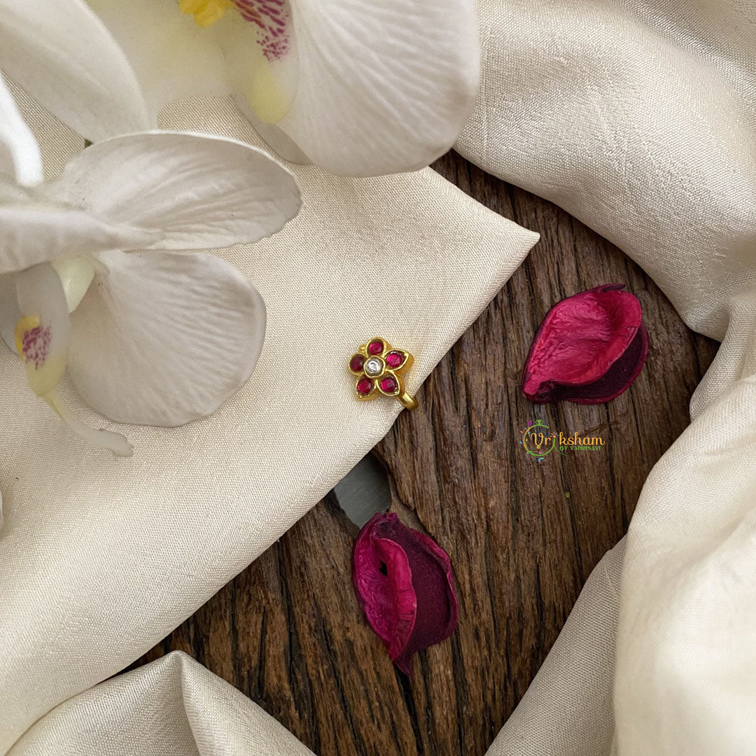 Elevate your style with Vriksham's Unique Floral Jadau Kundan Stone Nath/Nose pin. This elegant piece features intricate floral design, adorned with sparkling Kundan stones, and finished in a striking shade of red. A luxurious addition to your jewelry collection, perfect for any occasion. Grab yours now.