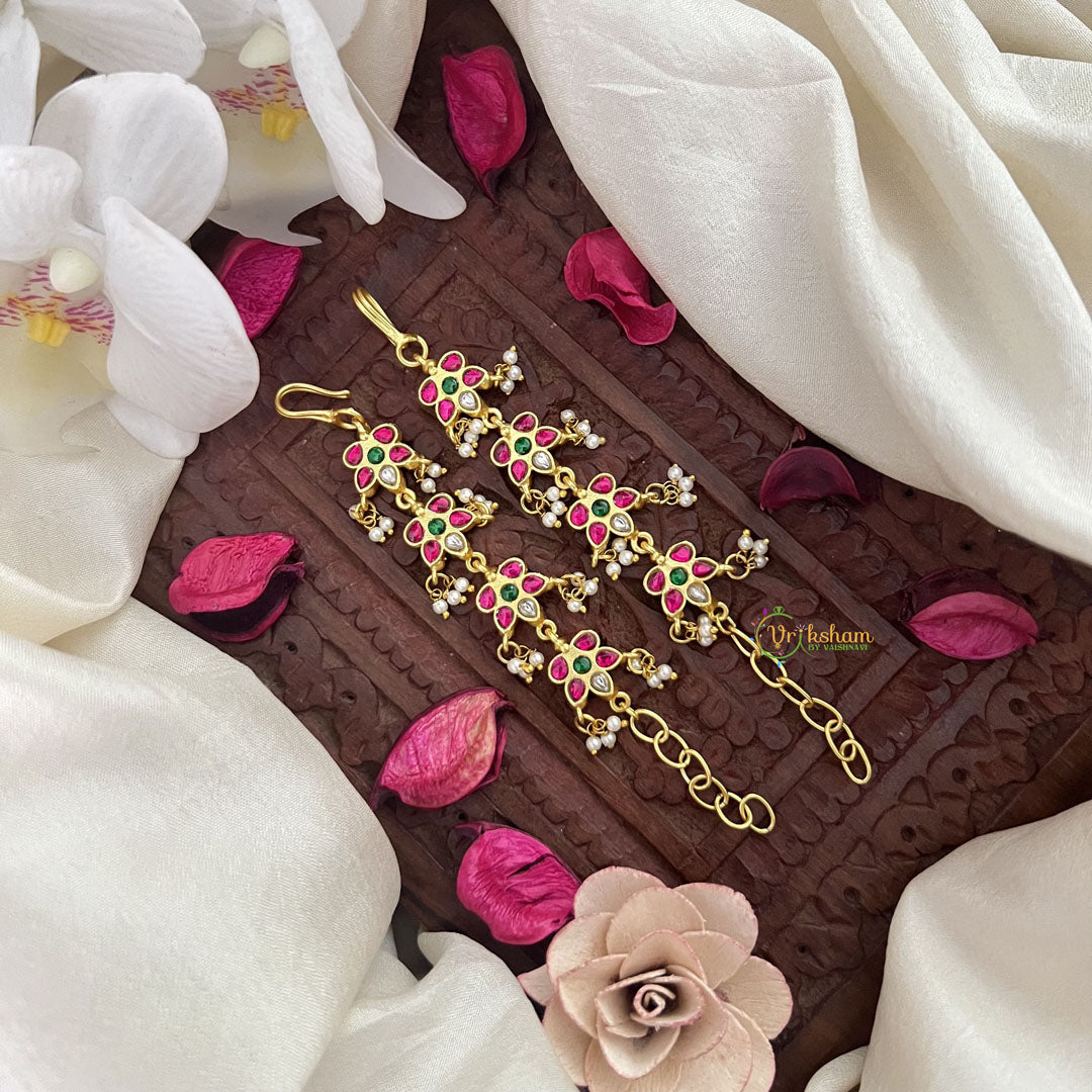 The Vriksham Unique Floral Kundan Jadau Single Strand Maatil features an exquisite floral motif crafted with red, green, and white rice pearls. This sophisticated necklace blends intricate traditional artistry with delicate elegance, making it an ideal accessory to elevate your ensemble with timeless beauty and grace.