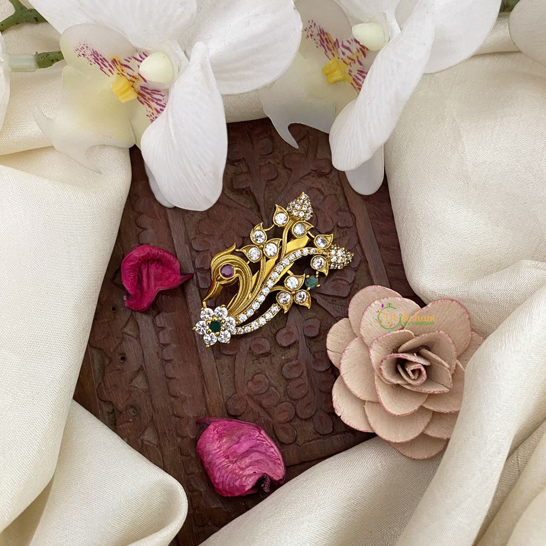 Introducing our Vriksham Unique Floral Peacock AD Stone Saree Pin, a dazzling adornment inspired by the majestic peacock. Featuring intricate floral designs and sparkling AD stones, this pin adds a touch of elegance and sophistication to any saree. Elevate your style with this luxurious and exclusive accessory.