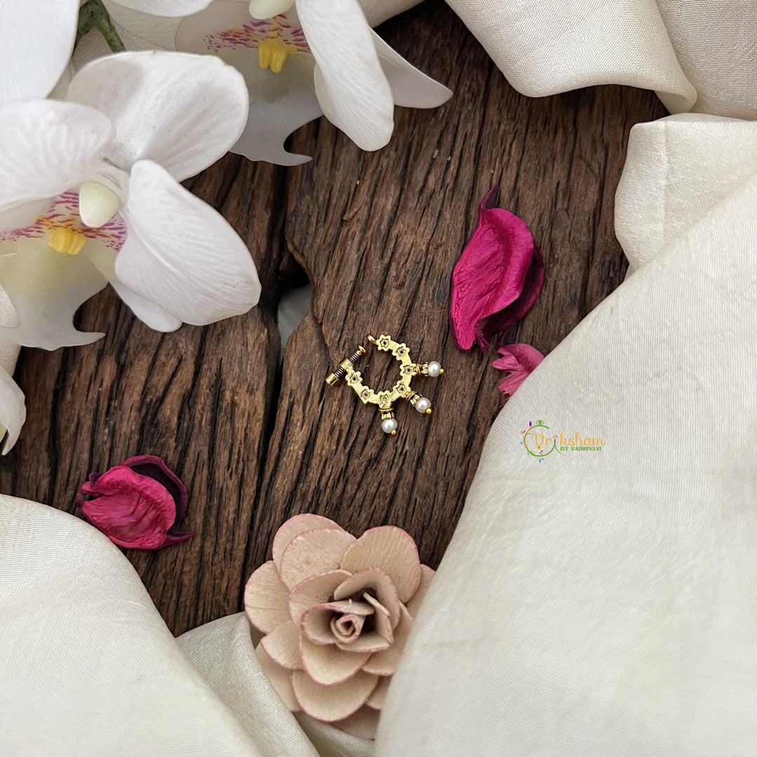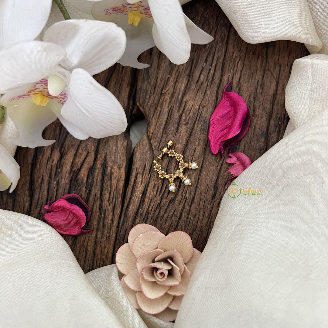 Elevate your elegance with the Vriksham unique Flower Naths featuring a striking red pearl centerpiece. This finely crafted nose pin blends traditional charm with contemporary design, perfect for adding a subtle yet sophisticated touch to any ensemble. Its delicate floral motif enhances your natural beauty while offering a timeless accessory for special occasions or everyday grace.