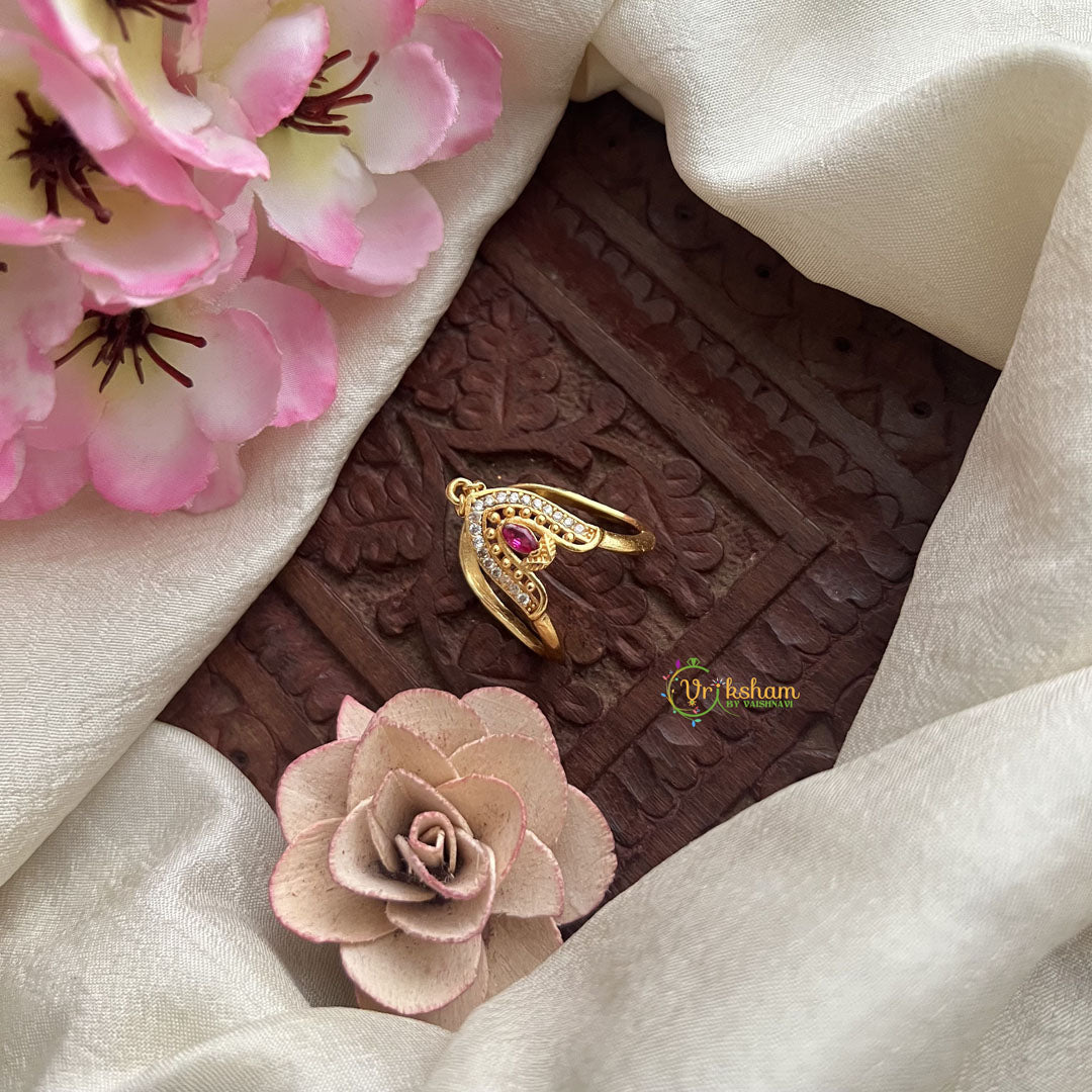 The Vriksham Unique Gold Look Alike Vangi Finger Ring showcases a refined design that balances modern elegance with timeless appeal. Its polished gold-look finish highlights meticulous craftsmanship, making it a sophisticated accessory that adds subtle luxury to any ensemble.