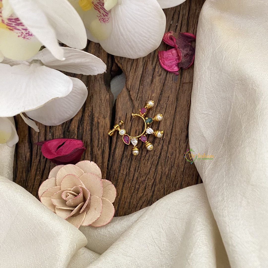Indulge in the ultimate luxury with our Vriksham Unique Golden Naths. Adorned with a lustrous pearl in a timeless red white & green hue, this nose pin exudes sophistication and elegance. Add a touch of glamour to any outfit and elevate your style game with this exclusive piece.