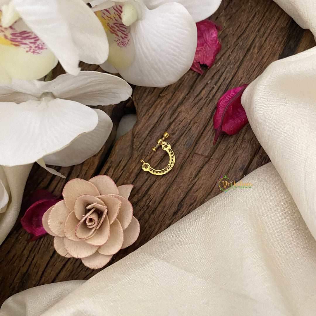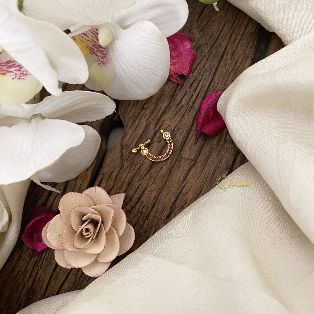 Enhance your elegance with our Vriksham Unique Golden Naths/Nose pin in Red White. The intricate design and luxurious golden finish add a touch of sophistication to any outfit. Elevate your style and make a statement with this exclusive piece.