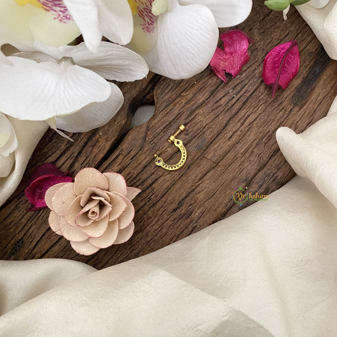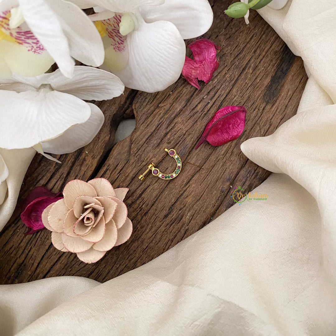 Enhance your elegance with our Vriksham Unique Golden Naths/Nose pin in Red White & Green. The intricate design and luxurious golden finish add a touch of sophistication to any outfit. Elevate your style and make a statement with this exclusive piece.