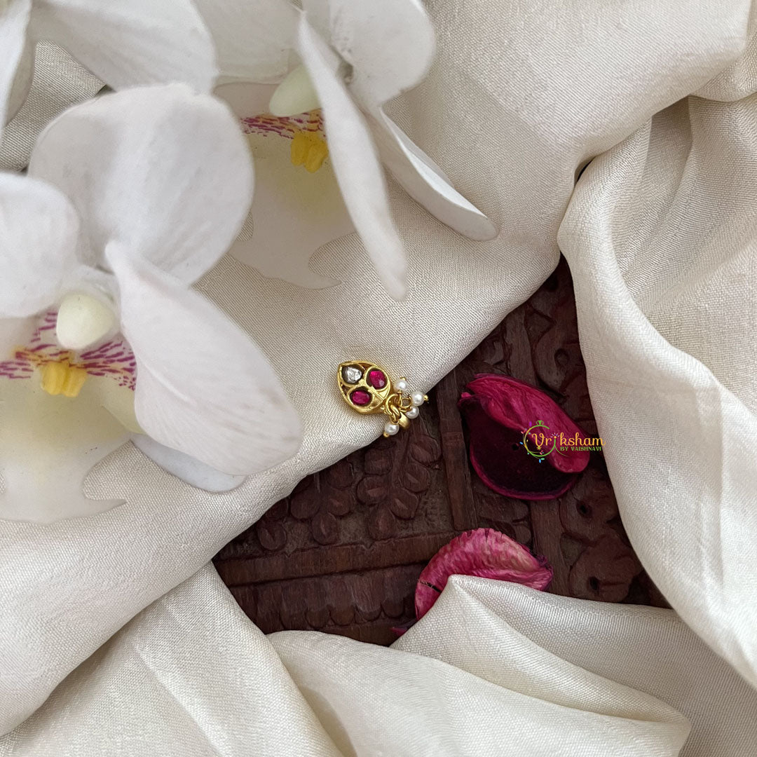 Elevate your style with our Vriksham Unique Jadau Kundan Nath, adorned with red and white pearls. Handcrafted with intricate details, this piece is a true masterpiece. Enhance your look with a touch of sophistication and luxury. Perfect for any special occasion or as a statement piece in your jewelry collection.