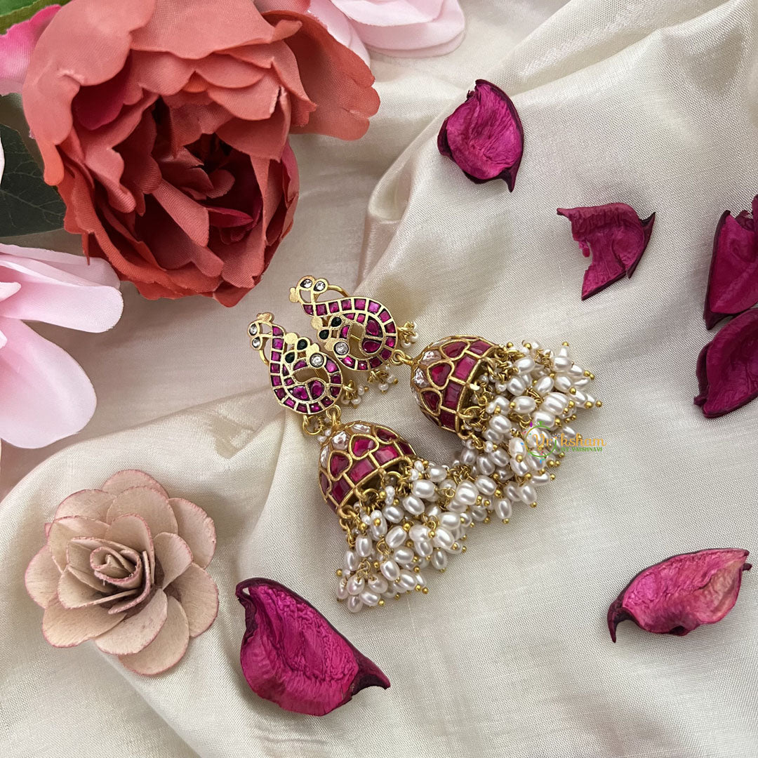 Indulge in the refined opulence of Vriksham's Unique Peacock Jadau Kundan Jhumkas. These distinguished ornaments showcase the revered peacock motif—a timeless symbol of grace and beauty—meticulously crafted using traditional Jadau Kundan techniques. The harmonious palette of rich red and pristine white creates a captivating visual narrative, thoughtfully enhanced with delicate rice pearls that add dimensional depth and subtle luminosity. The classic jhumka silhouette offers graceful movement with each gesture.