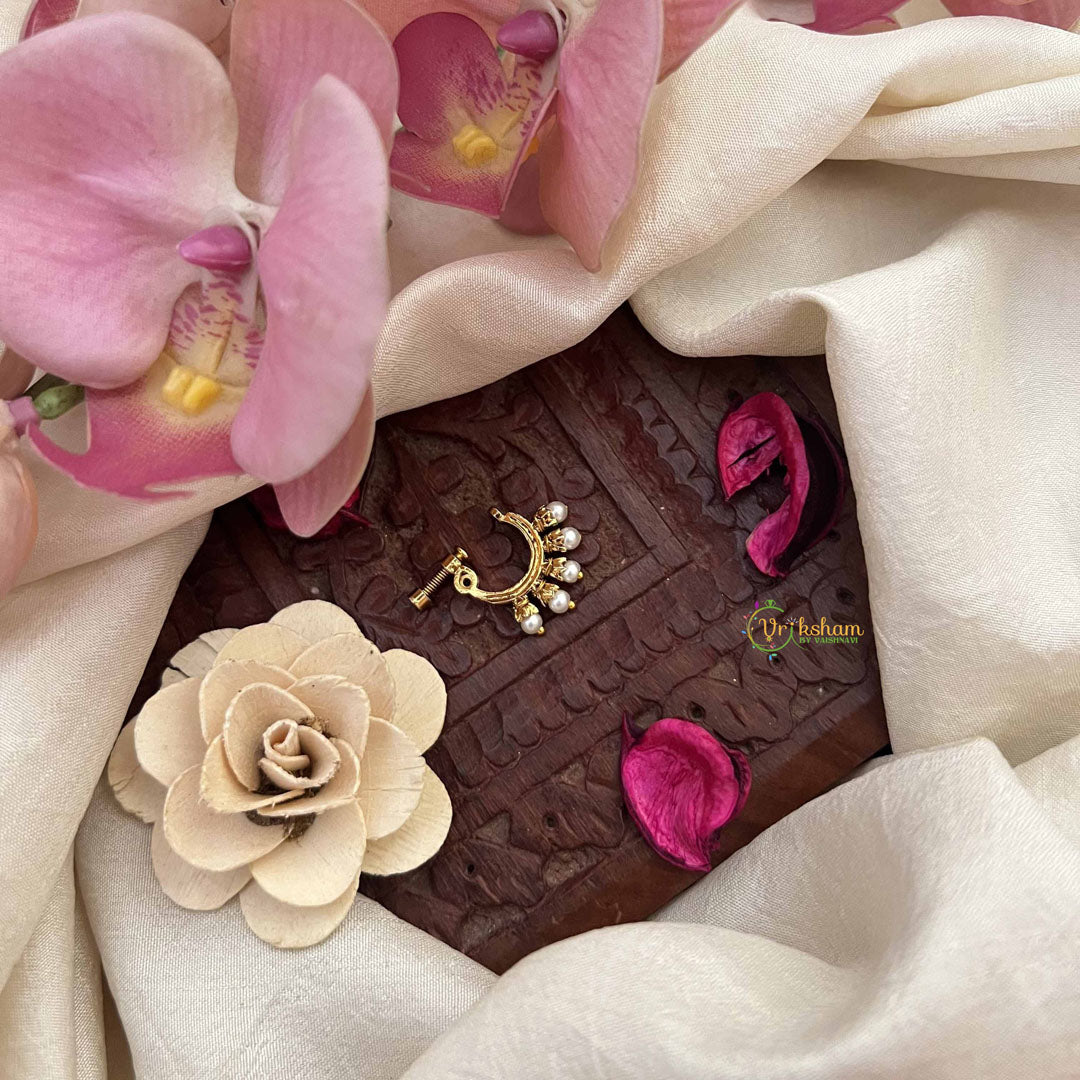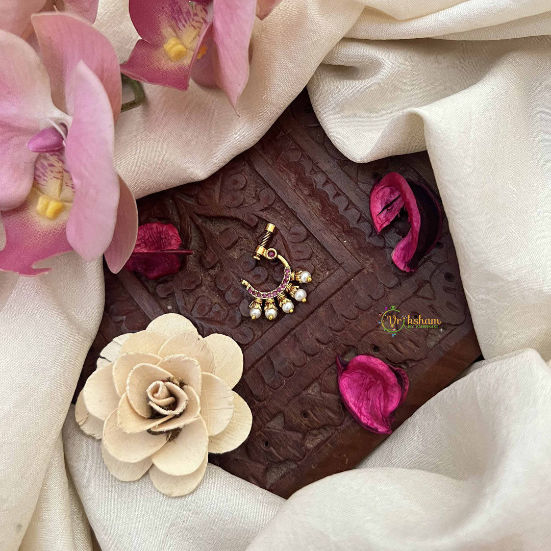The Vriksham Unique Peacock Motif Style Press Naths in red pearls features a detailed peacock-inspired design adorned with radiant pearls. Designed for a secure and comfortable press fit, this nose pin offers a striking yet elegant accent, perfect for elevating traditional and contemporary looks with refined sophistication.