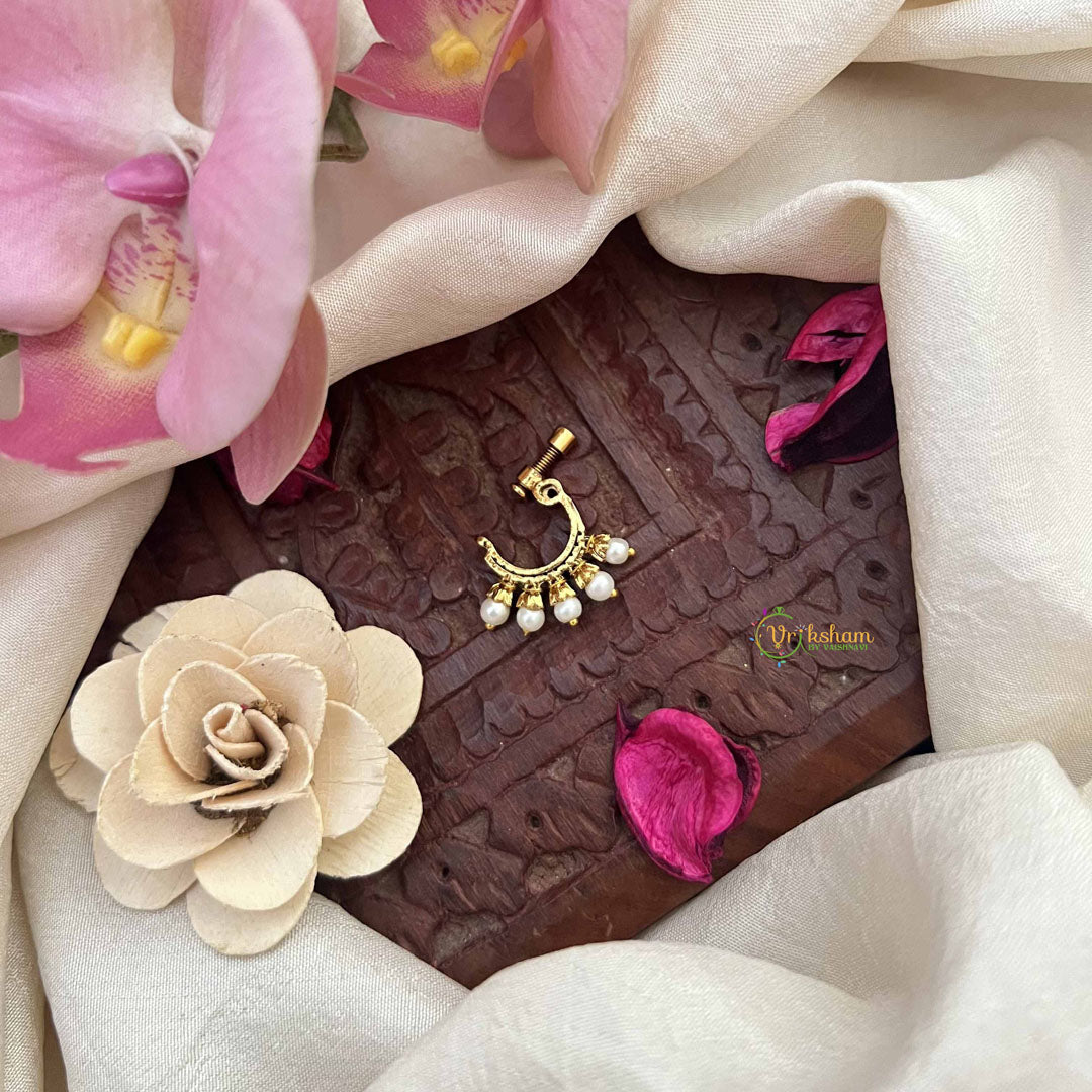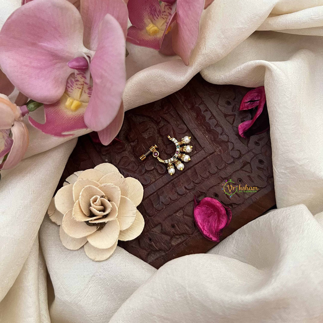The Vriksham Unique Peacock Motif Style Press Naths for the right nose side features an elegant peacock design adorned with red, white, and green pearls. Crafted for a secure and comfortable press fit, this nose pin brings a graceful blend of vibrant colors and intricate detail, perfect for enhancing traditional and contemporary looks with refined sophistication.