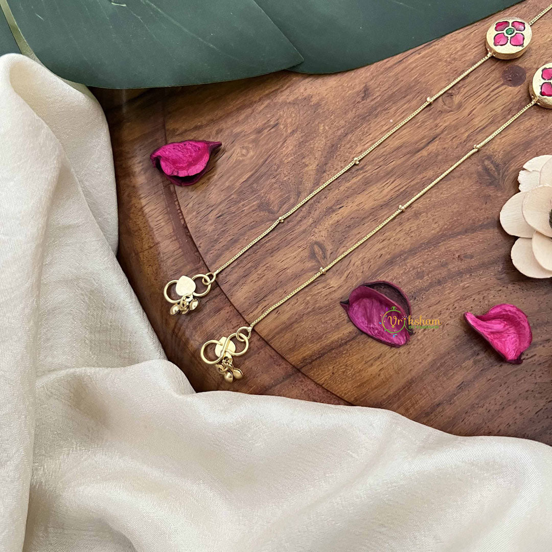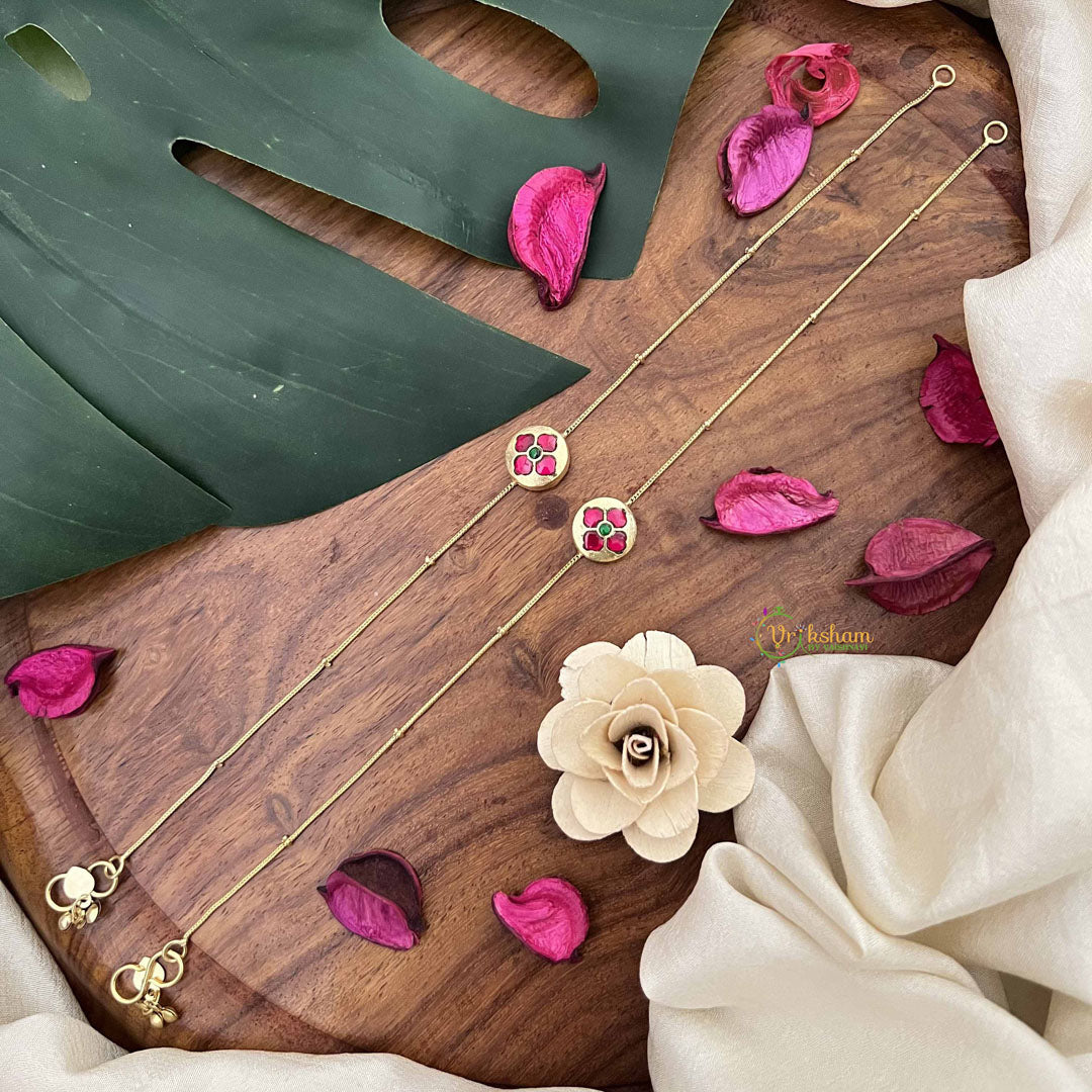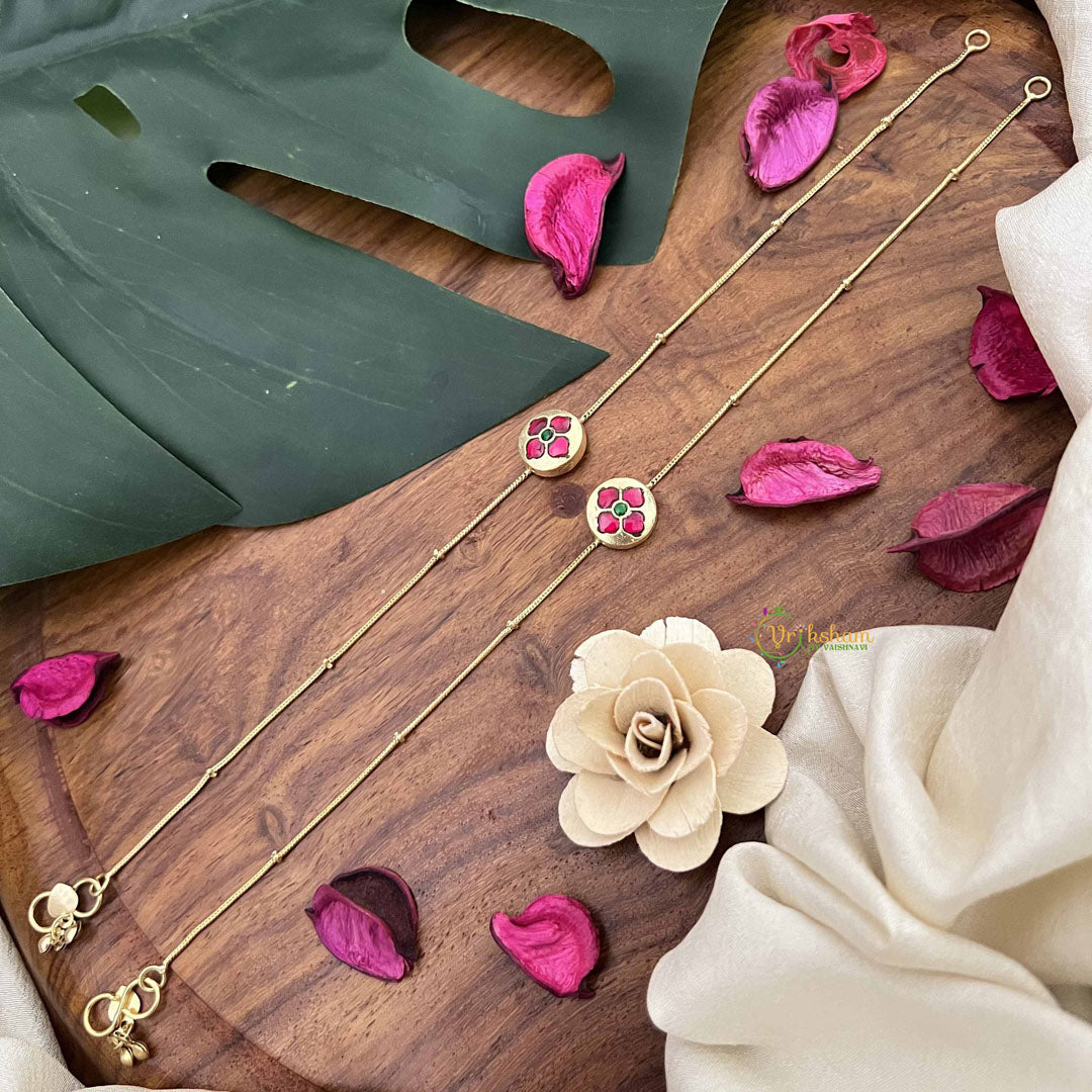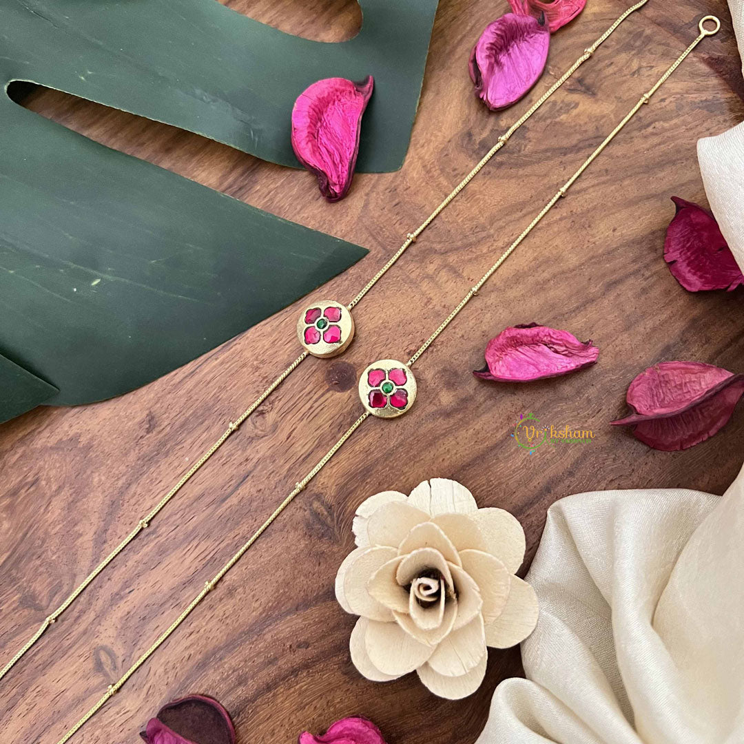 Elevate your ankle jewelry collection with this exquisite red floral stone pendant anklet. Crafted with meticulous attention to detail, the vibrant gemstone pendant features an intricate floral design that captures light beautifully. Perfect for adding a touch of elegance to traditional attire or contemporary ensembles, this piece seamlessly transitions from festive occasions to everyday wear. The sophisticated craftsmanship ensures durability while maintaining a refined aesthetic. An ideal accessory for those who appreciate distinctive, artisanal jewelry that makes a graceful statement.