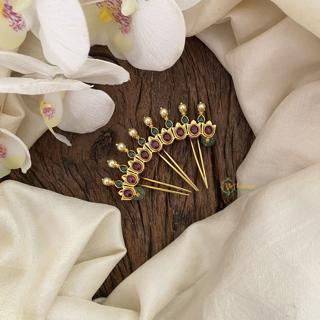 Introducing Vriksham's Unique Red Green Bun Billai-Jada Billai, a truly one-of-a-kind piece. Adorned with vibrant red and green accents, this bun billai-jada billai will elevate any hairstyle with its luxurious and exclusive touch. Experience the ultimate in elegance and sophistication with this stunning addition to your collection.