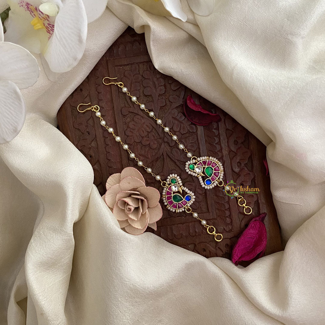 Indulge in the elegance of Vriksham's Unique single strand white pearl Maatil-red green-Annam. This exquisite masterpiece features a single strand of lustrous white pearls, symbolizing purity and grace. Elevate any outfit with this luxurious accessory, perfect for any sophisticated occasion.