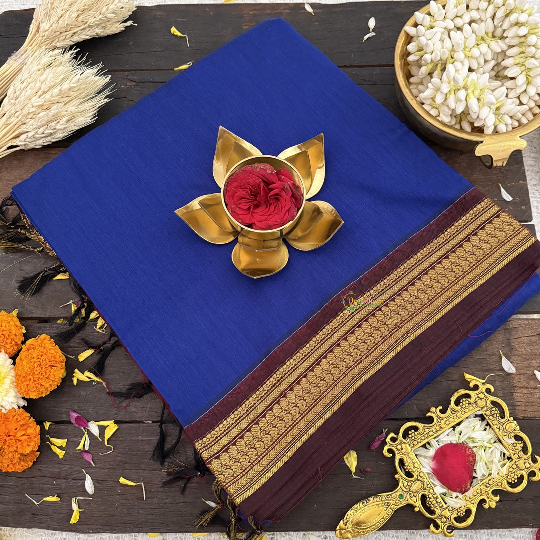 The Vriksham Vibrant Blue Kalyani Cotton Saree, accented with a deep maroon border, offers a serene yet striking combination of colors. Crafted from breathable cotton, it ensures comfort while presenting a refined and elegant look. Perfect for formal occasions or stylish everyday wear, this saree adds a sophisticated touch to your wardrobe.