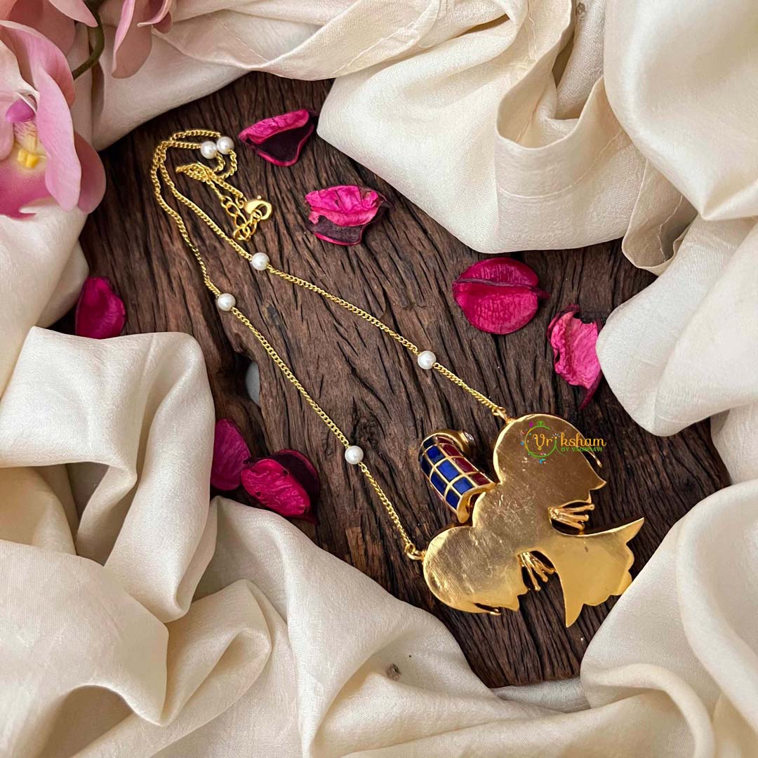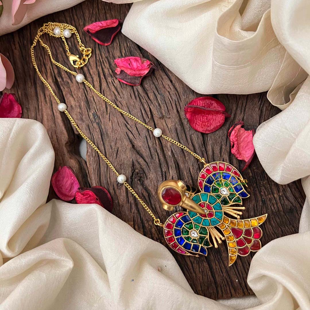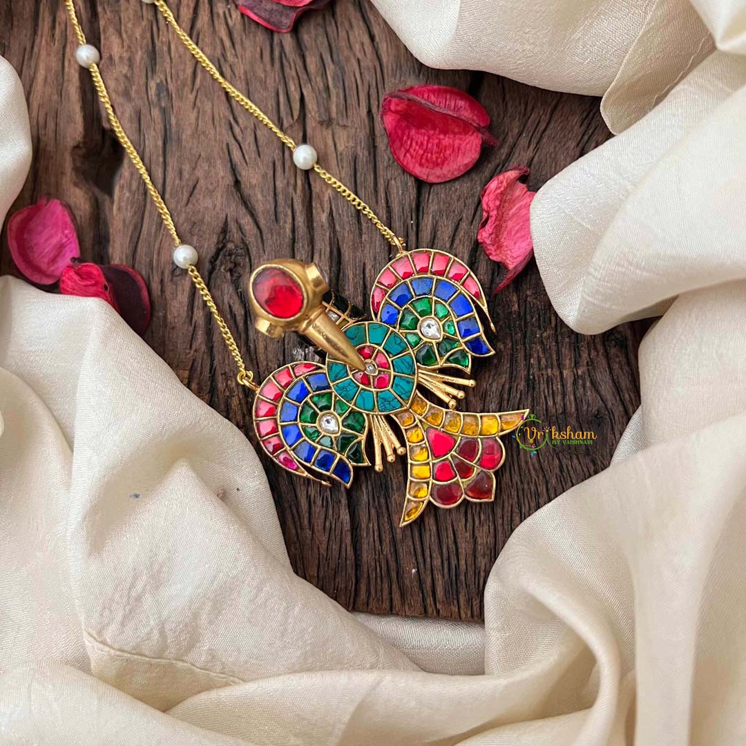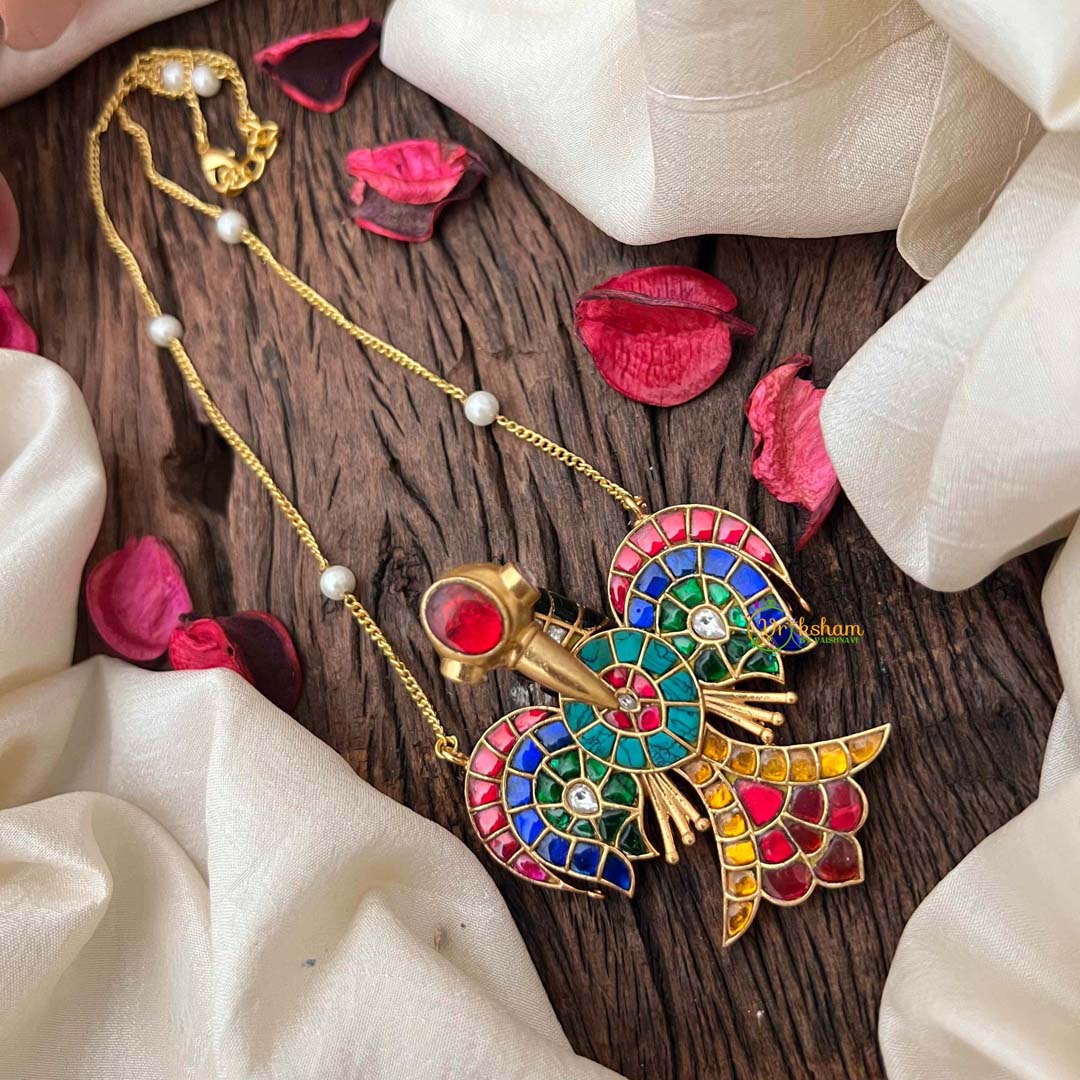 Celebrate celestial beauty with this resplendent Navaratna-style pendant necklace, featuring the GandaBenda bird adorned in rich multi-color Kundan Jadau against a warm gold finish. The delicate pearl chain elegantly suspends this jeweled masterpiece, allowing the vibrant gemstone palette to command attention. Rooted in ancient astrological tradition, this piece harmonizes nine sacred stones with masterful Indian craftsmanship, creating a powerful talisman of elegance. Perfect for those seeking jewelry that transcends decoration, offering both visual magnificence and spiritual resonance.