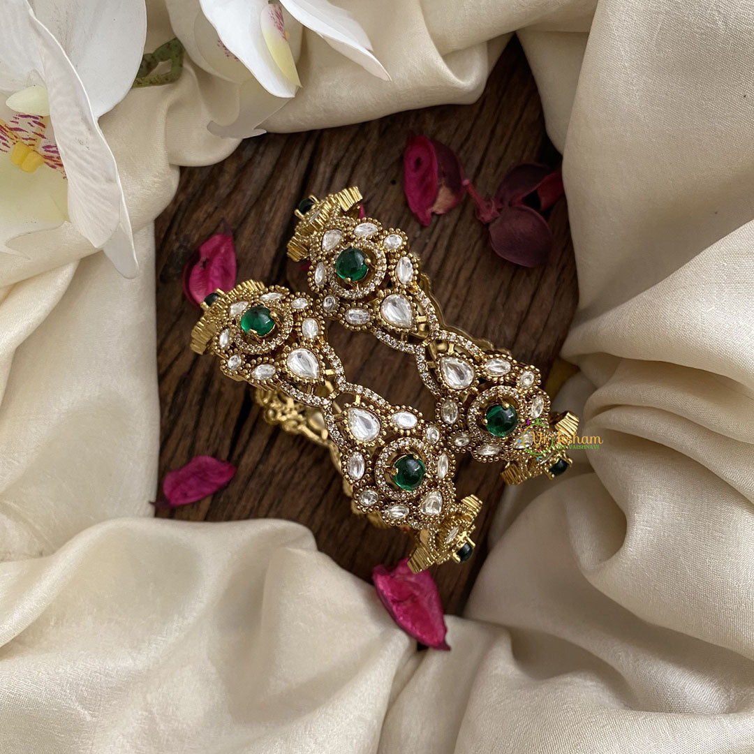 Indulge in elegance with our Vriksham Victorian Diamond Bangles in a stunning shade of green. These bangles feature intricate Victorian-inspired design and sparkling diamonds, adding a touch of luxury to any outfit. Elevate your style and make a statement with these exclusive bangles.