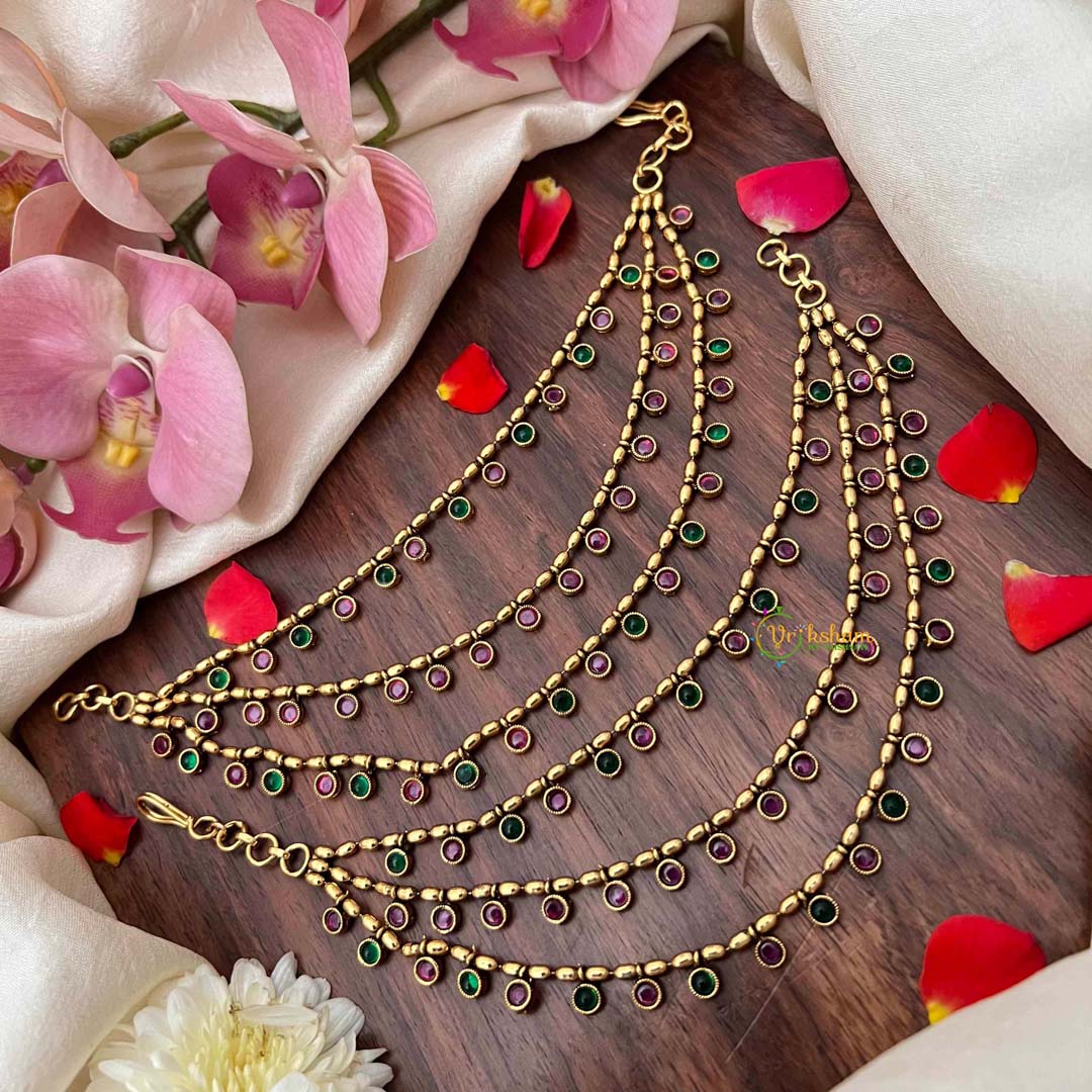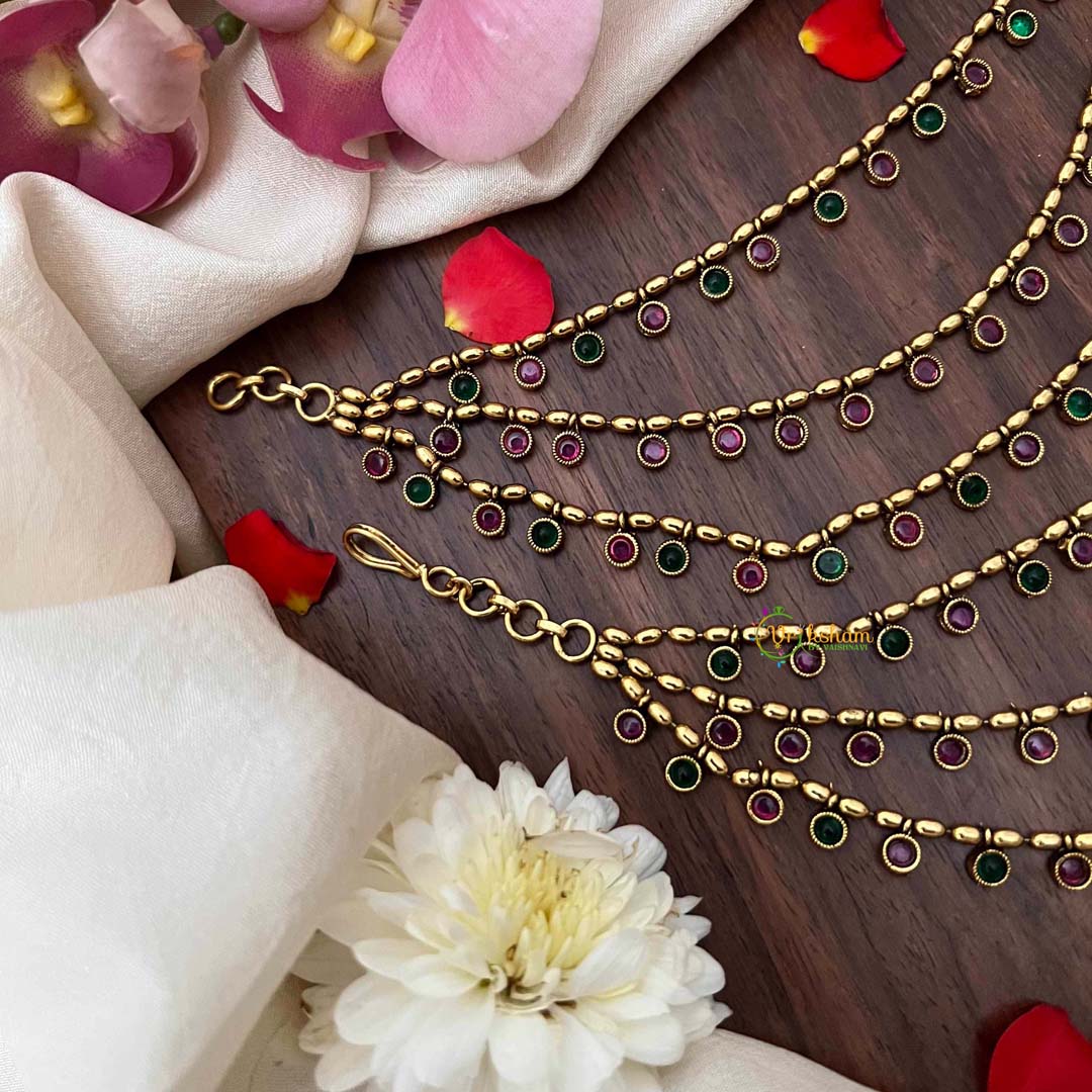 Experience vintage charm with this exquisite maatil, featuring a lustrous gold finish across three sumptuous layers. Embellished with petite red and green drops, this piece creates a harmonious balance of jewel-toned elegance that evokes timeless sophistication. The interplay of crimson and emerald accents against the warm golden backdrop produces a captivating visual depth, perfect for festive celebrations, weddings, and cherished occasions. A truly refined accessory that celebrates vintage aesthetics with vibrant character, ideal for those who appreciate nuanced beauty and cultural richness.