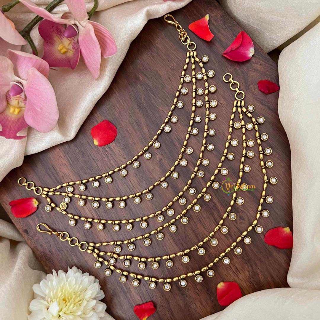 Embrace nostalgic elegance with this enchanting vintage-inspired maatil, rendered in warm gold finish across three graceful layers. Delicate white drops cascade throughout the design, creating a subtle yet captivating interplay of light and shadow that evokes timeless romance. The refined three-layer construction and pearl-like accents lend an air of understated sophistication, perfect for weddings, festive gatherings, and cherished occasions. A truly distinctive accessory that marries vintage charm with contemporary sensibility, ideal for those who appreciate classic beauty with a modern twist.