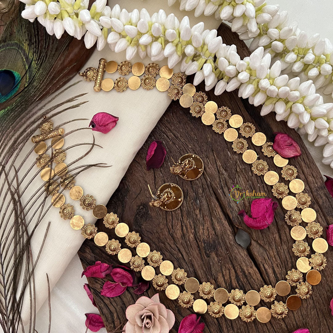 The Vriksham Vintage Gold Tone Coin Double Layer Long Neckpiece exudes timeless sophistication with its elegant design. Featuring two layers of intricately crafted gold-tone coins, this piece adds depth and richness to your ensemble. Its vintage-inspired style complements both traditional and contemporary outfits, making it an ideal accessory for special occasions. Elevate your look with this refined neckpiece that blends classic charm with modern elegance.