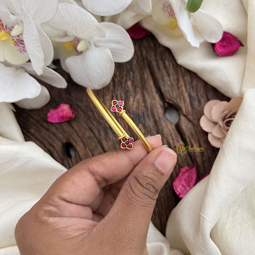 Embody timeless elegance with the Vriksham Vintage-Inspired Ruby Flower Openable Kada. Featuring vibrant ruby-red floral accents, this openable design ensures a perfect, comfortable fit. Its classic craftsmanship and vintage charm make it a graceful statement piece, ideal for adding sophistication to any ensemble.