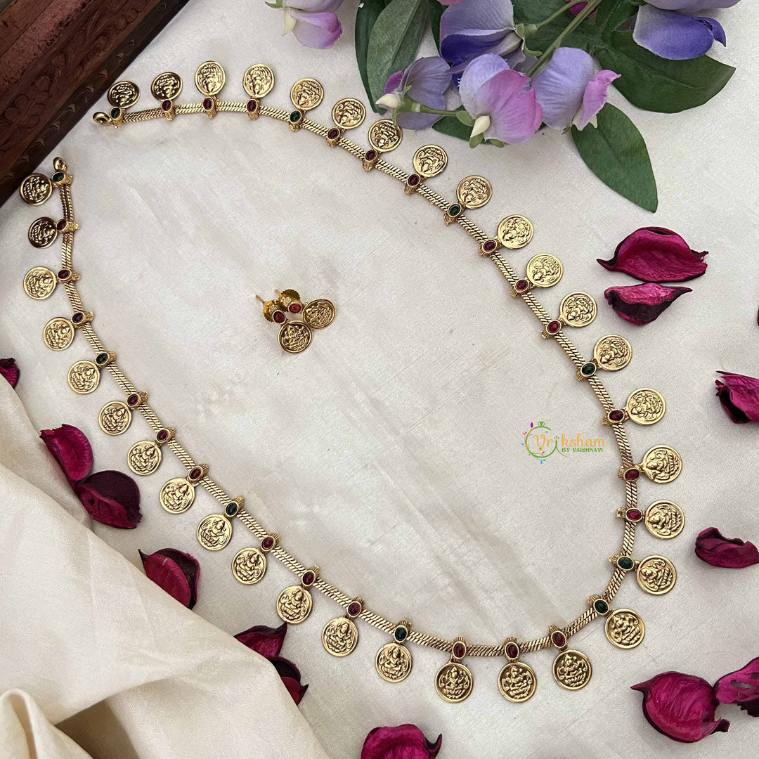 This vintage-style Kasu Haram features a classic Lakshmi coin intricately embellished with both red and green stones. The harmonious blend of colors and detailed craftsmanship creates a refined accessory that embodies traditional elegance. Perfect for cultural celebrations, this piece adds a touch of timeless sophistication to any ethnic outfit.