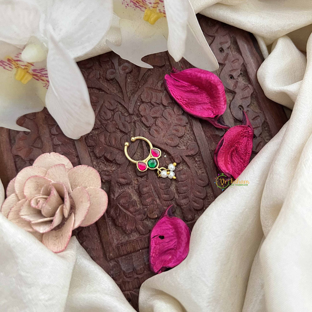 The Vriksham Vintage Style Septum Ring & Pearls in Green Red features a refined combination of rich green and red accents paired with elegant pearls. This sophisticated design adds timeless charm and subtle color contrast, making it an ideal accessory to enhance traditional outfits with vintage-inspired grace for special occasions.