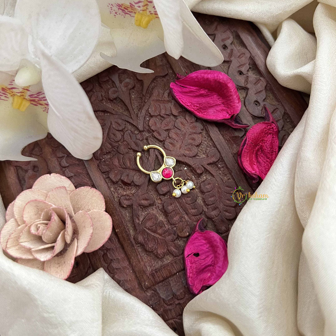 The Vriksham Vintage Style Septum Ring & Pearls in White Red combines classic white pearls with vibrant red accents in a beautifully crafted design. This sophisticated piece offers timeless elegance and a refined touch, perfect for enhancing traditional outfits with subtle color and vintage-inspired charm. Ideal for special occasions and festive celebrations.