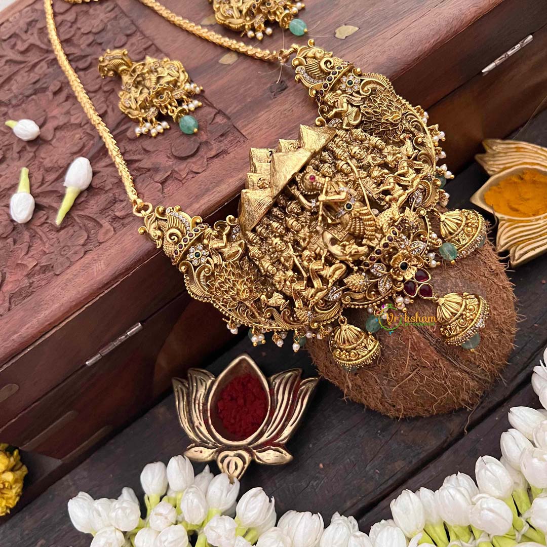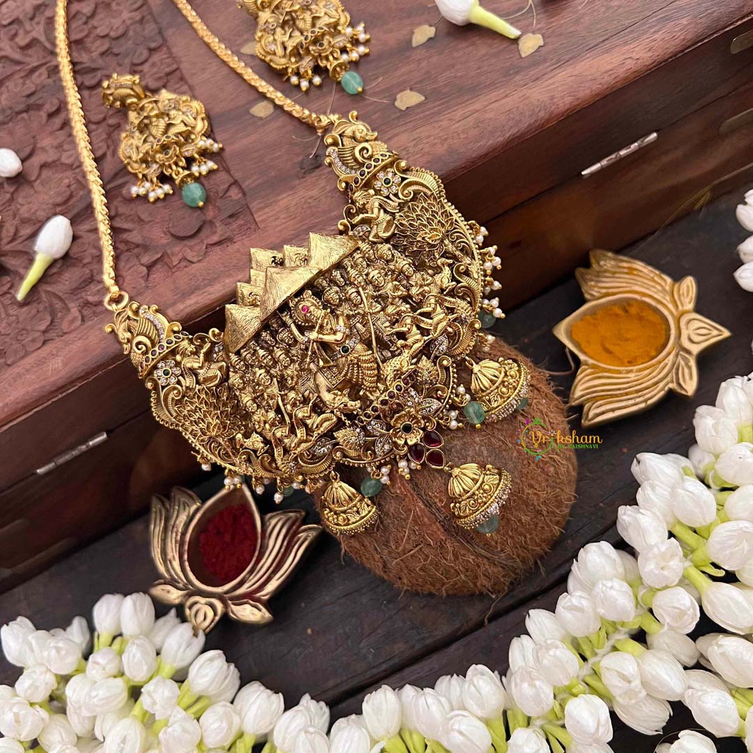 Discover the enchantment of Vrindavan with this Heritage Krishna Nakshi neckpiece, a masterpiece of intricate artisanal work. The AD stone pendant showcases Lord Krishna rendered through traditional nakshi craftsmanship, suspended from a refined chain that drapes with understated elegance. Sparkling stones create a luminous quality, evoking the divine radiance associated with Krishna's presence in the sacred groves of Vrindavan. This extended neckpiece seamlessly bridges spiritual devotion with contemporary sophistication, making it an exceptional choice for brides and those seeking meaningful jewelry. Each detail reflects the artisan's dedication to preserving heritage techniques, offering a wearable connection to timeless spiritual traditions and cultural richness.