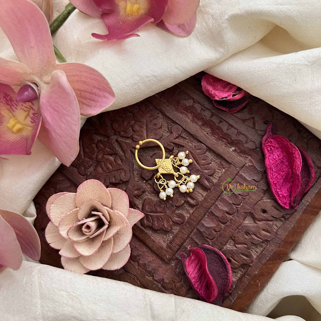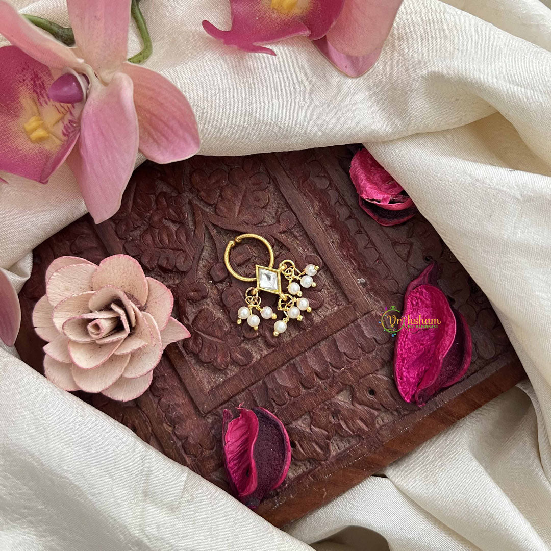 This gold-toned Kundan Jadau septum ring features a stunning emerald centerpiece elegantly framed by clusters of lustrous pearls. Expertly crafted to highlight traditional artistry, it adds a refined touch of sophistication to any ensemble. Perfect for enhancing your elegance during special events or celebrations.