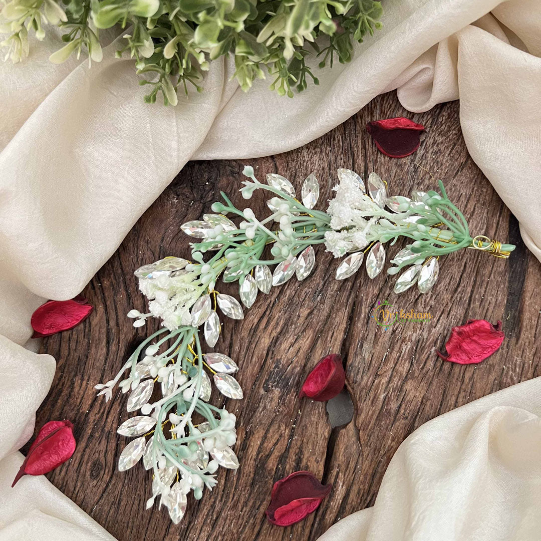 The Vriksham White Floral Brown Crystal Beaded Style Broach Gajra features elegant white blossoms accented with warm brown crystal beads. This sophisticated accessory adds a subtle and refined touch to traditional attire, ideal for weddings and special occasions.