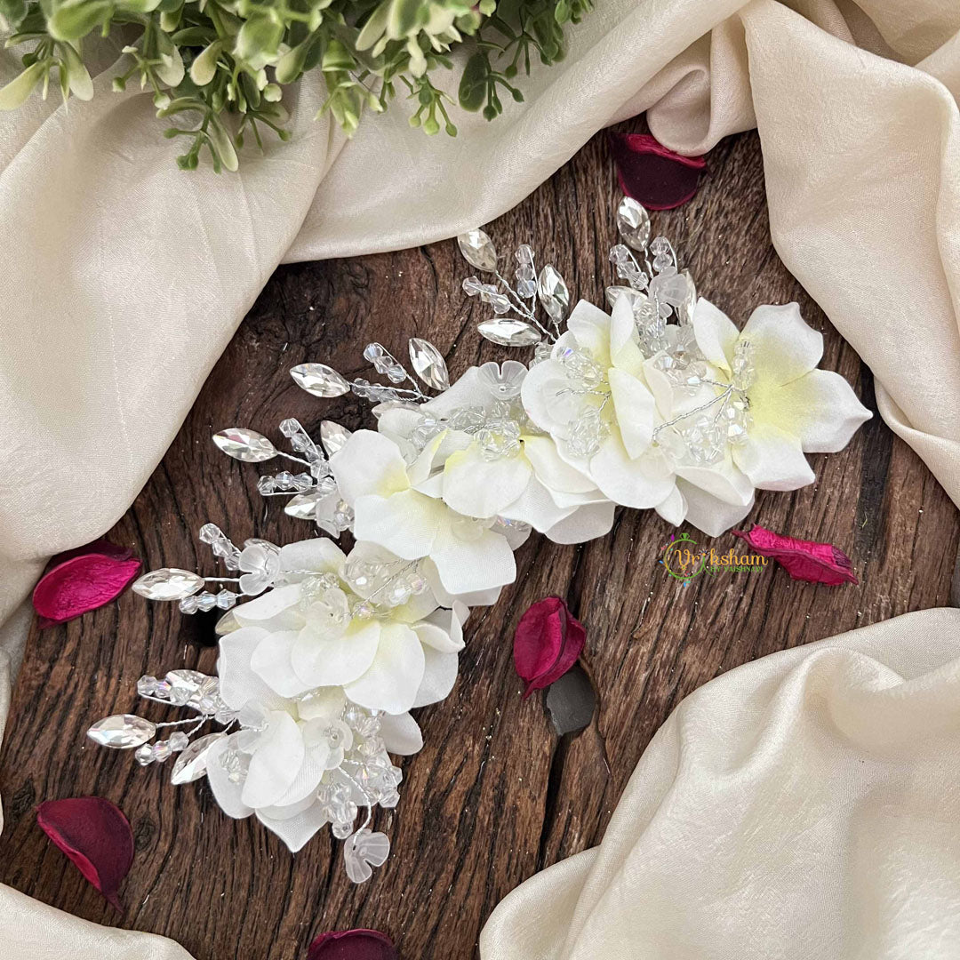 The Vriksham White Floral Crystal Beads Gajra features pristine white blossoms accented with sparkling crystal beads. This sophisticated accessory adds a timeless and elegant touch to traditional hairstyles, perfect for weddings and special occasions.