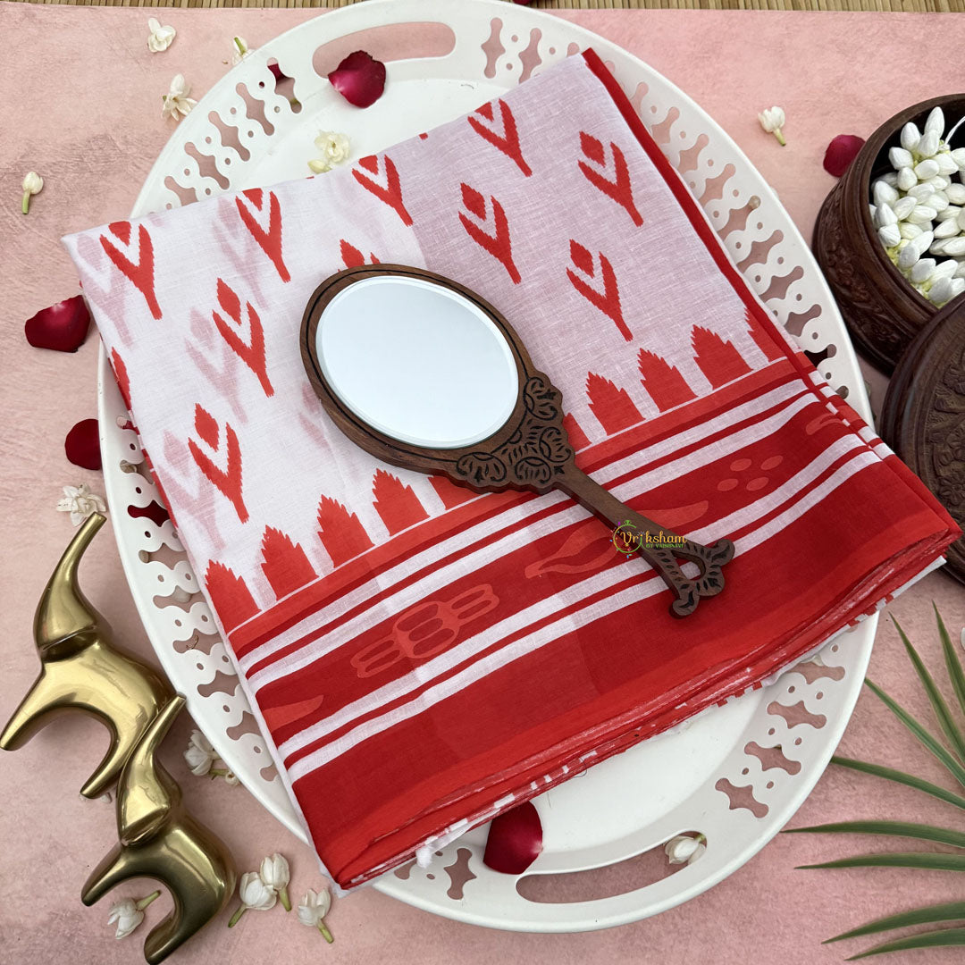 Experience timeless elegance with the Vriksham White Printed Cotton Mulmul Saree, featuring a striking red border that adds a refined contrast. Crafted from soft, breathable mulmul cotton, this saree offers comfort and grace for any occasion. Its delicate print and lightweight fabric make it perfect for warm days, while the vibrant border enhances your sophisticated style effortlessly. Ideal for those who appreciate classic charm with a modern touch.