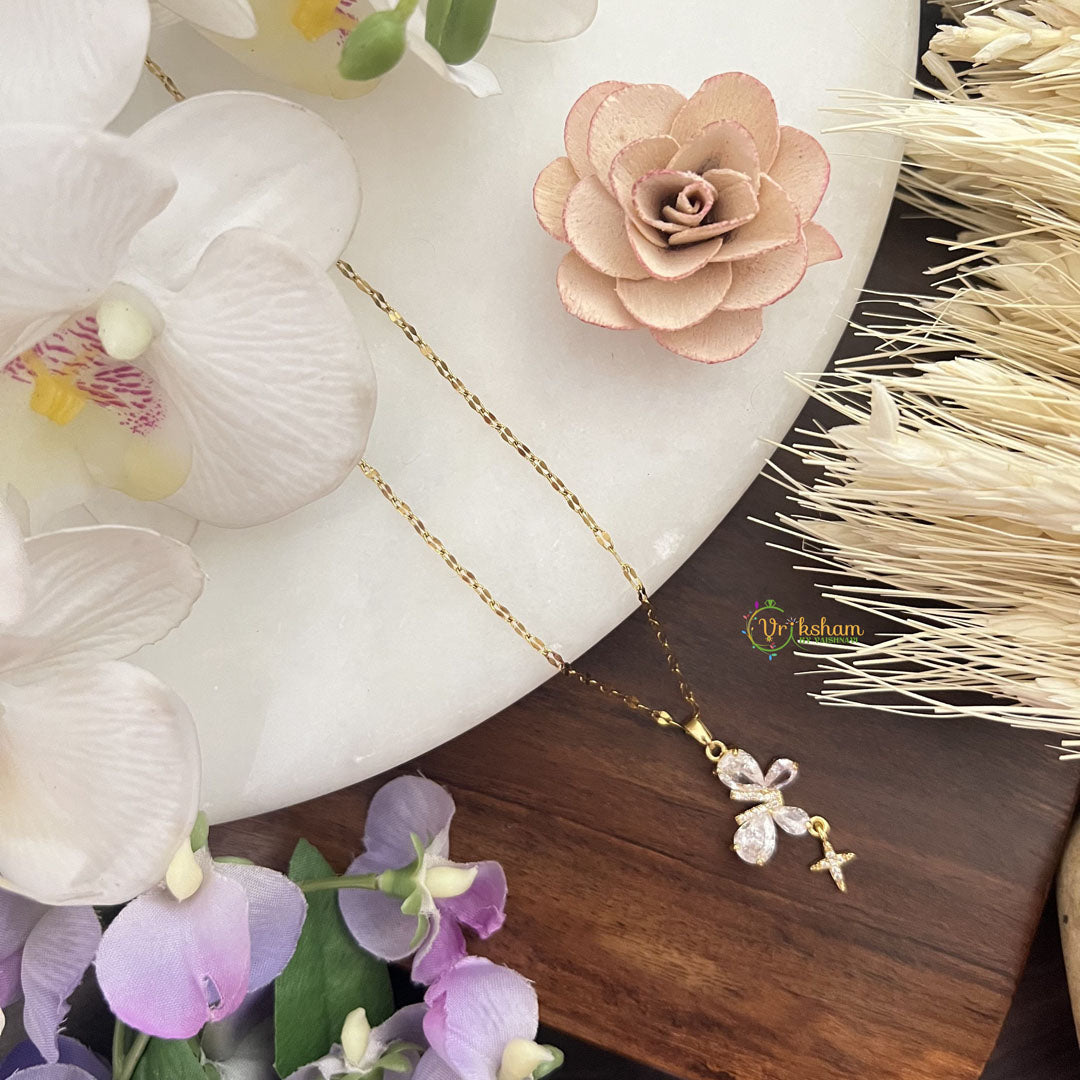 The Vriksham White Stone Butterfly Pendant is a sophisticated and exclusive piece that exudes luxury. Crafted with anti-tarnish stainless steel, this necklace chain features a stunning white stone butterfly pendant. Its elegant design and high-quality materials make it a perfect addition to any upscale jewelry collection.