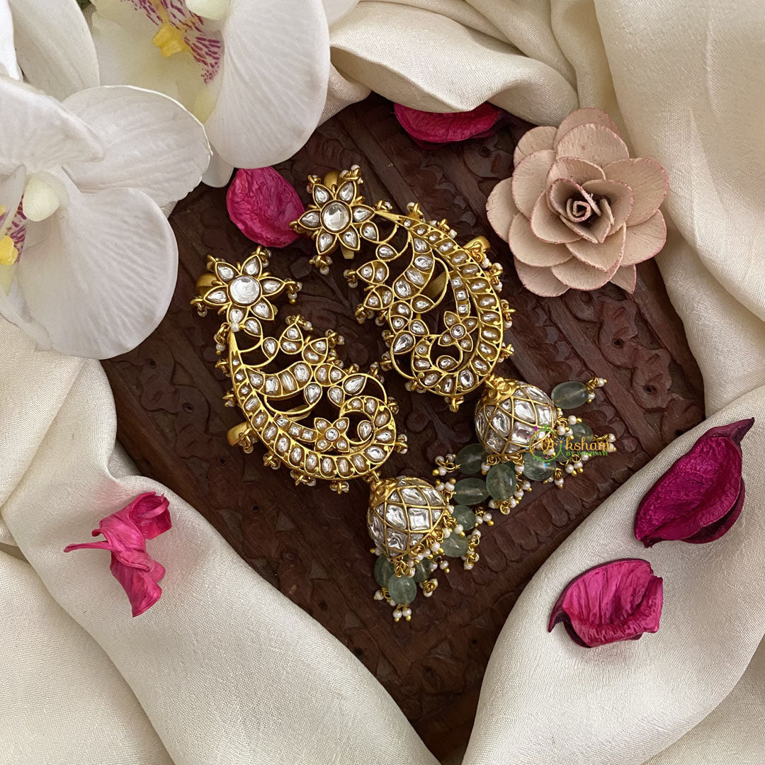 Elevate your style with the exquisitely handcrafted Vriksham White Stone Kundan Jadau Cuff Jhumka adorned with Pastel Green Beads. Each piece is meticulously made with intricate details and superior craftsmanship, offering a touch of luxury to any outfit. Experience the elegance and exclusivity of this stunning piece.