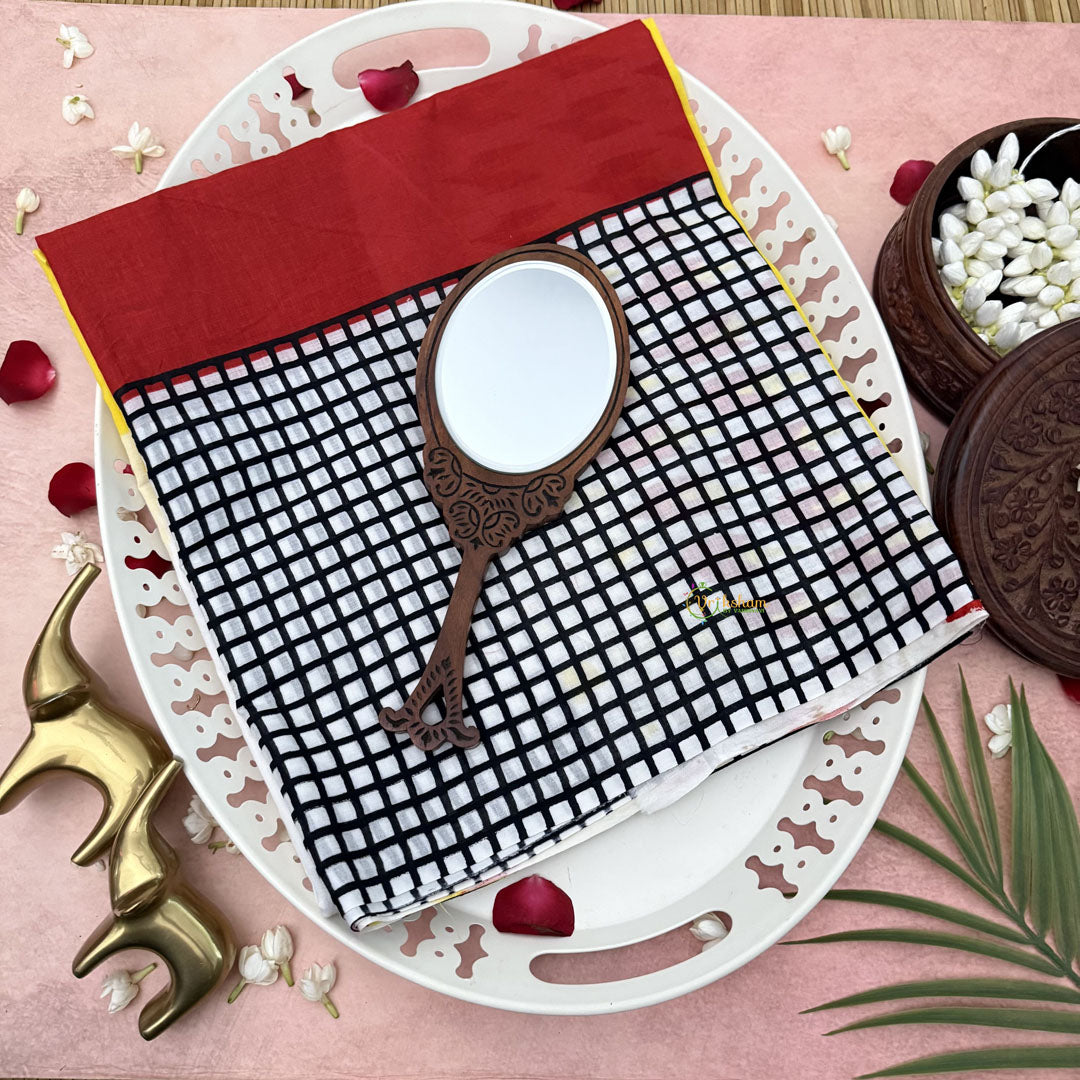 The Vriksham White Cotton Mulmul Saree features a subtle half-checks border that adds a refined geometric touch to its classic appeal. Made from lightweight, breathable mulmul cotton, this saree ensures comfort while maintaining an elegant silhouette. Perfect for both formal and casual occasions, it embodies understated sophistication with every drape.