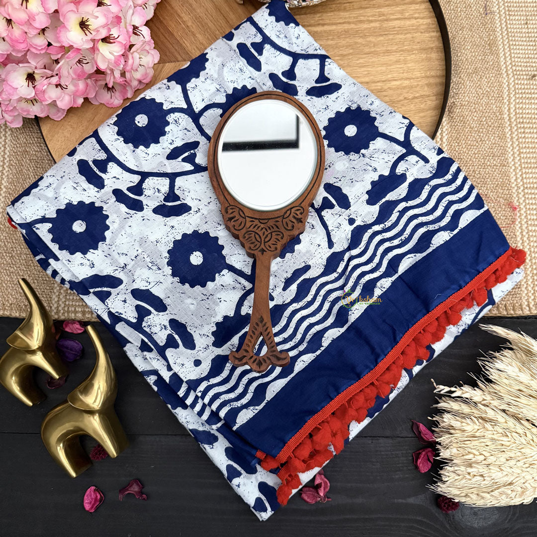 Introducing the Vriksham White with Indigo Floral Print Cotton Mulmul Saree - the epitome of luxury and sophistication. Made from the finest cotton mulmul fabric, this saree is lightweight and comfortable, perfect for everyday wear. The elegant White with indigo floral color and intricate design makes it a must-have for any fashionista. Elevate your wardrobe with this exclusive piece.