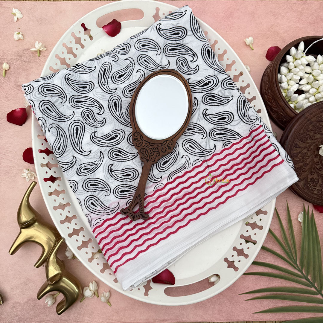 Experience timeless elegance with the Vriksham White With Paisley Printed Cotton Mulmul Saree. Crafted from soft, breathable cotton mulmul, this saree features delicate paisley prints that add a subtle yet refined charm. Its lightweight fabric ensures comfort throughout the day, making it perfect for both casual and formal occasions. Embrace a sophisticated look that blends tradition with understated style.