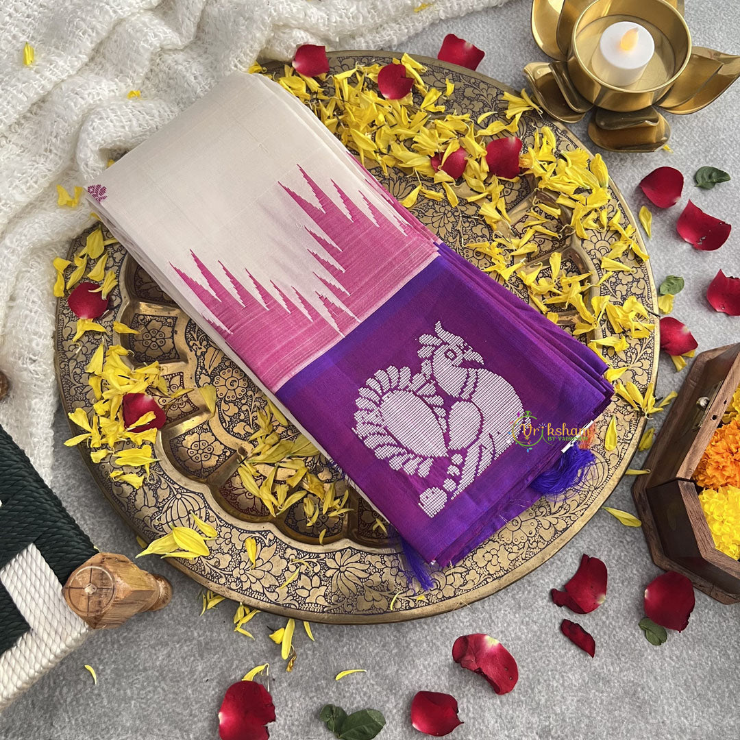Indulge in elegance with our Vriksham White with Purple Korvai Thiribhuvanam Silk Saree. Crafted from pure silk, this saree boasts a sophisticated white and purple design with traditional Korvai Thiribhuvanam detailing. Elevate your wardrobe and make a statement with this premium quality saree.