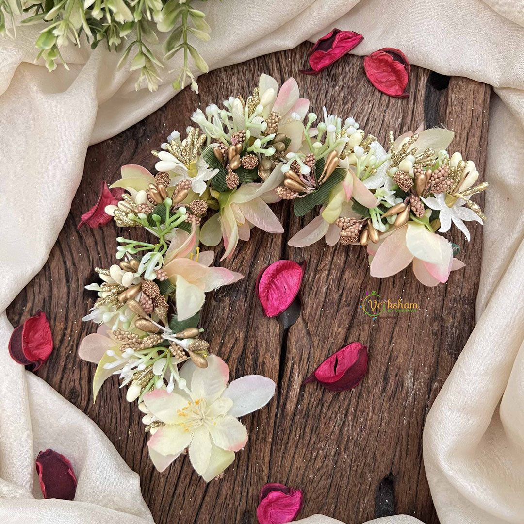 The Vriksham White & Yellow Shade Floral With Beads Veni Gajra features a tasteful combination of pristine white and soft yellow blossoms accented with delicate beads. This sophisticated accessory lends a fresh and elegant touch to traditional hairstyles, ideal for enhancing your ensemble during weddings and special celebrations.